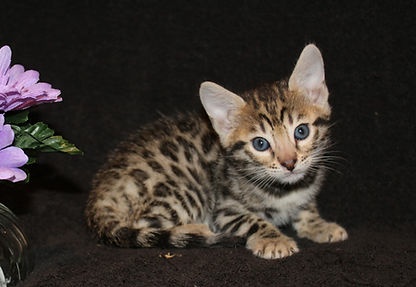 Marking description and details: Golden Rosette Bengals have the appearance of a small cheetah with a beautiful golden and tan tones to their undercoat with Black and Dark Brown rings called rosettes. these look like cheetah spots. they have very angular faces with black stripes and Bold Eye liner. Silver Bengals are more rare than Rosettes but similar to Snow Bengal in Rarity. They have a dark grey to light grey undercoat with striking black spots and anll the same markings of the rosette in deep black that pops and gives them a striking look onces they reach maturity. Lastly, our most popular but smallest amount available (3-4 born a year), Snow Bengals have Beautiful Silky Hair that develops into a pattern similar to a snow leopard. The Snow Bengal is a more unique, white version, of the breed. The kittens are born pure white and take about a month to start displaying the outlines of their markings. Stripe and spot outlines are becoming visible by the time the kittens go home and continue to develop as the kitten reaches maturity. Legs, Tail, Ears, Face, and stomach have the most apparent markings early on. they become more and more crisp and striking each month. final look for all of the versions is reached around 18 months. The males are a bit larger than an average cat and love to walk on leashes and show off in public! They are EXTREMELY affectionate and want to be held and snuggled 24/7!
