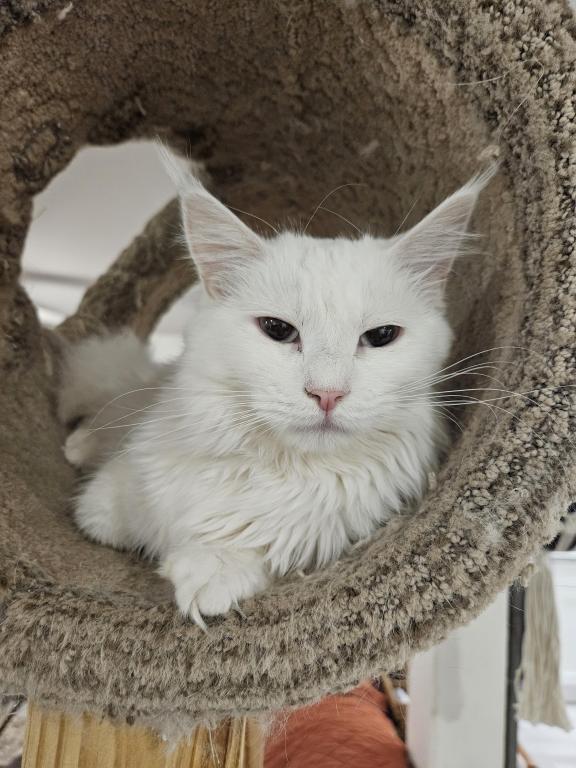 Joule- Female. Half tail, straight feet, light blue gray eyes. Very sweet talkative girl with beautiful ear tufts! She loves chasing ice and rolling around on the cool tile of the bathroom floor.