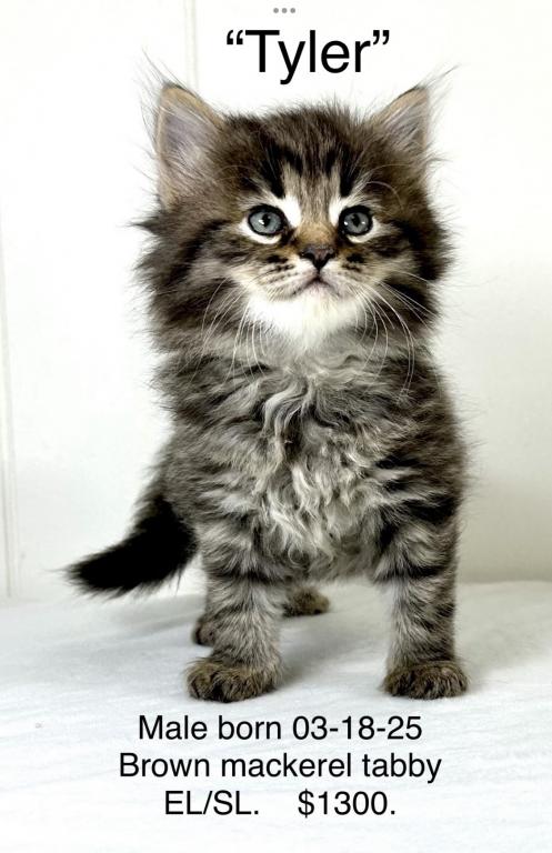 “Tyler” is another handsome boy from our cattery. He is a brown mackerel tabby kitty, who thinks he’s a tiger! Tyler is very “middle of the road”. Playful enough, but loves to be cuddled. Likes to explore and romp a bit, but wants your lap. You get a little bit of everything with him! At Kristails Siberians we make the adoption process as simple as possible, while keeping our prices very reasonable. We also have access to a few certified ground pet transporters with reasonable rates for your convenience. If you’re looking for your new best friend - HERE HE IS! He’s just waiting to leap into your arms! CONTACT US TODAY AND HE IS YOURS! Kristailssiberians.com, Kristailssiberians@gmail.com, TEXT US 845.672.0456.