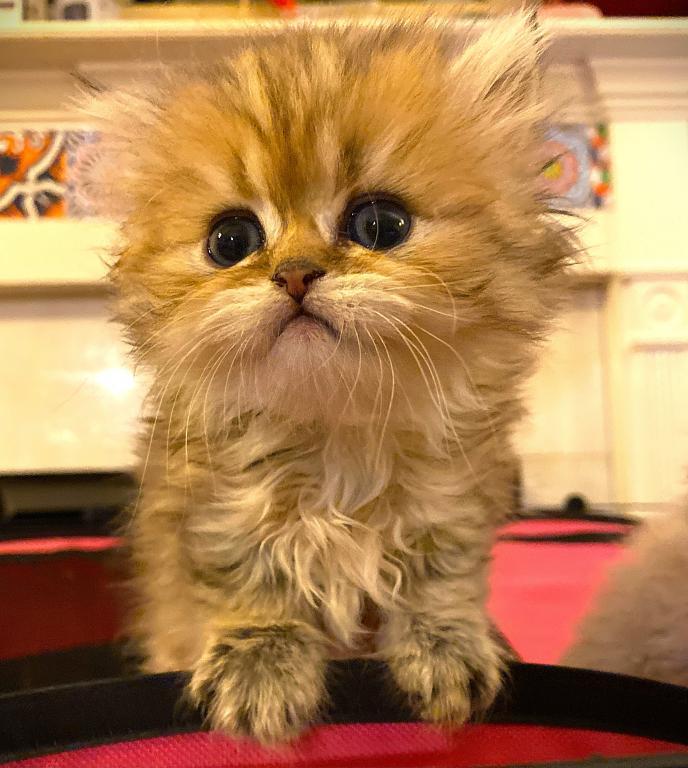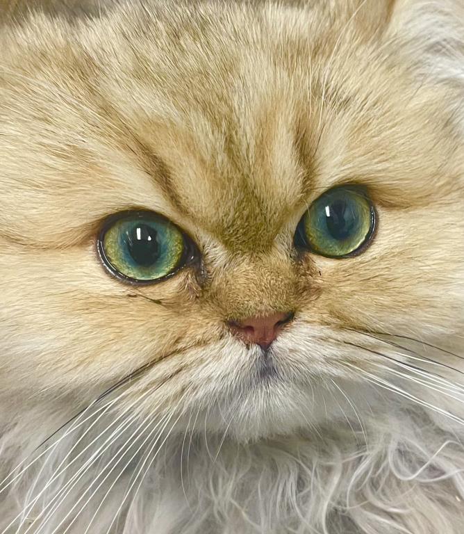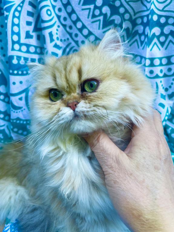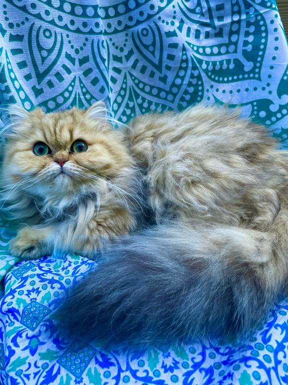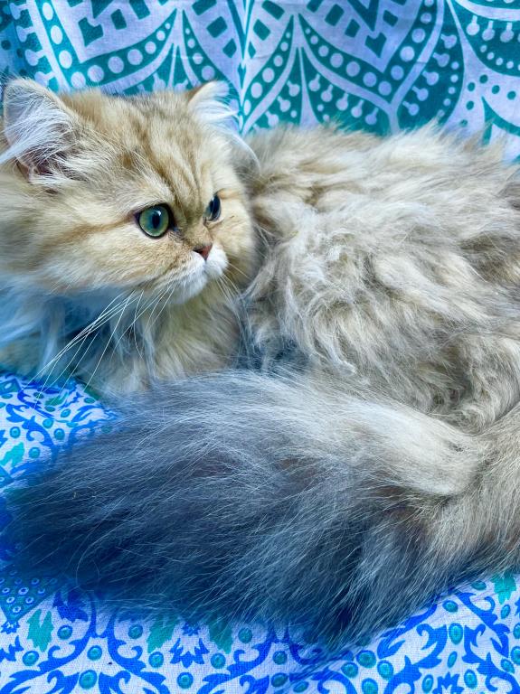 Meet Nobu, he is CFA Chinchilla Golden Persian. His fur is super fluffy with the huge tail! Yes, he will need regular brushing and grooming. He's intelligent, calm and quiet. He will make a great family pet with mature children or adult only home environment. He will get along fine with other cats but hasn't been around any dogs. We will adopt him only to someone who has experiences with Persian breed. Right now, his coat is trimmed to short. His dad is a blue golden imported from France and has Golden Ray and Brettachtal's bloodline.