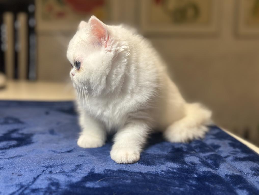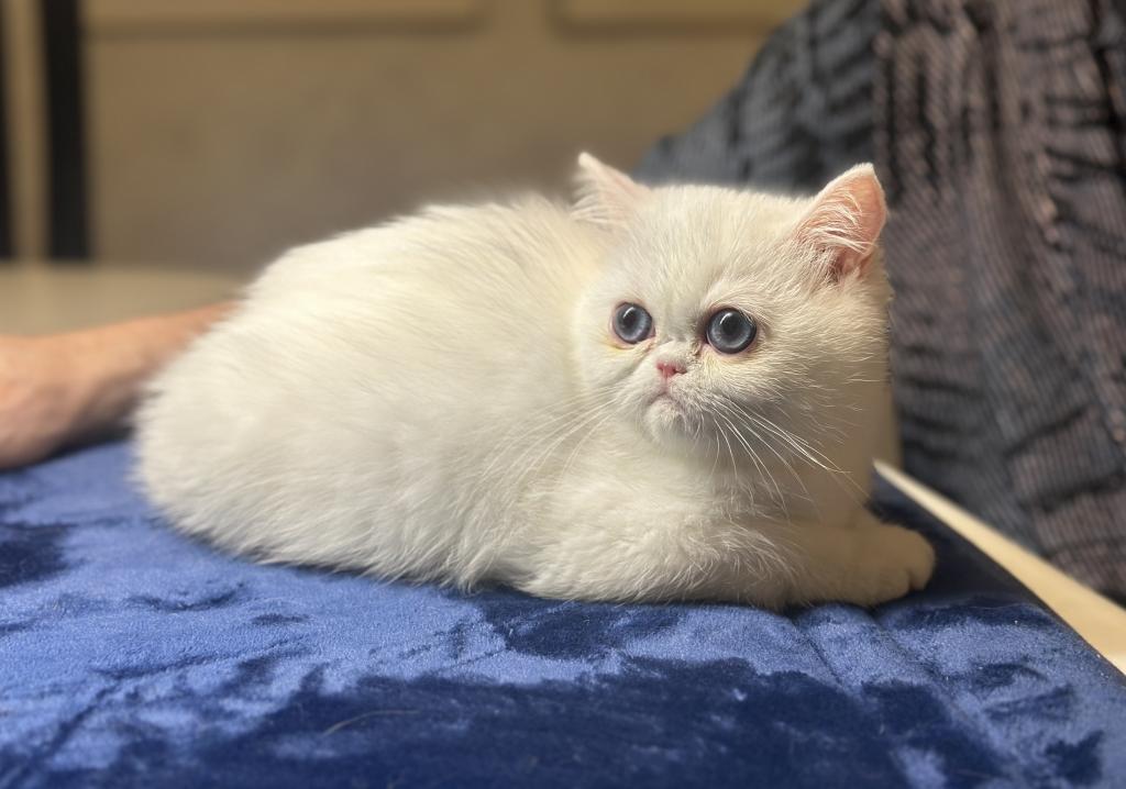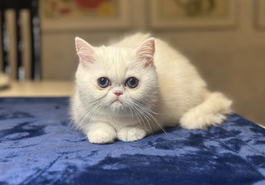 This is a WHITE EXOTIC PERSIAN short hair blue-eyed female Kitten. CFA - Cat Fancier's Assoc. Registered. She is a beautiful, hardy and playful kitten that is ready to be reserved by her new forever owner! She has National, Regional and Grand Champion bloodlines. She is hand raised - very playful, friendly, loving and litter box trained. All of my kittens come from an FeLV, FIV and PKD negative cattery; are fully vaccinated; come with a Veterinary Health Certificate and Health Guarantee. THANKS FOR YOUR INTEREST!! For further information and to reserve her, please send me a message. I'm looking forward to hearing from you!