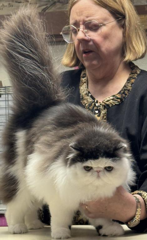 Black and white Persian female and solid white Persian male. Kittens will be black and white, solid black and solid white.