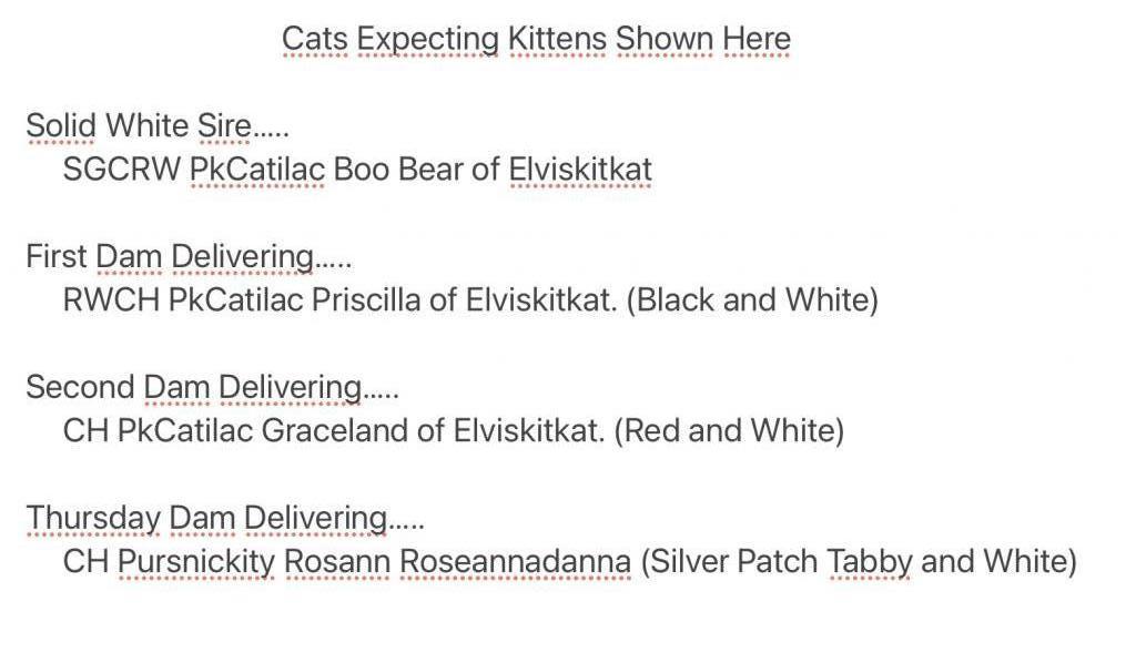 Esconder litter: September 20th, Graceland and Boo Bear parents. Other is red and white and father is solid white. Possible kitten colors will be solids white, Red,Cream, Black or Blue. Calicós, Dilute Calicos, red and whites , black and whites, blue and whites and cream and whites.