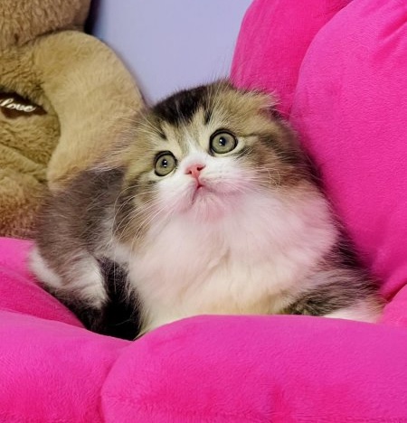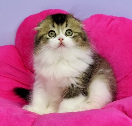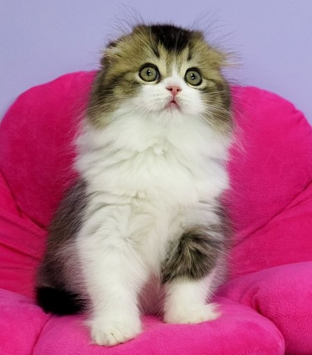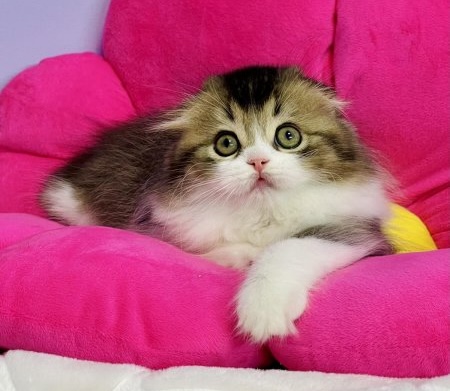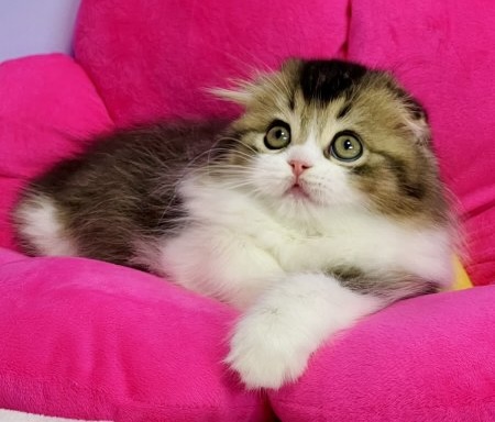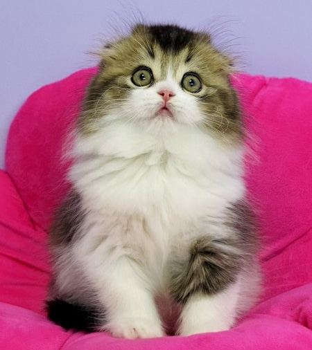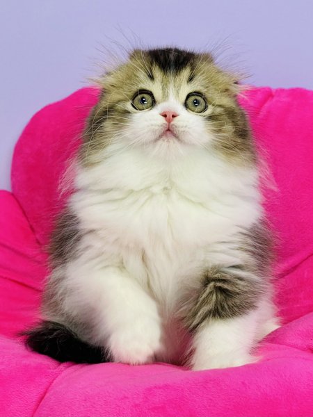 Ihor is a distinguished Scottish Fold male cat featuring a striking black ticked tabby bicolour coat. Known for their unique folded ears and calm temperament, Scottish Folds like Ihor combine charming appearance with a gentle, affectionate nature. His distinctive coat pattern adds to his visual appeal, making him an exceptional companion for those seeking a blend of elegance and personality in a feline friend.