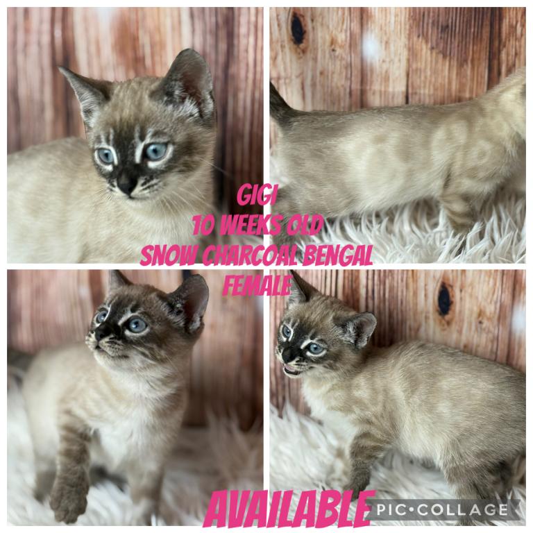 This kitten is a snow mink! Gorgeous colors! She is from a little of seven her mom is a brown Bengal and Dad is a smoke Bengal