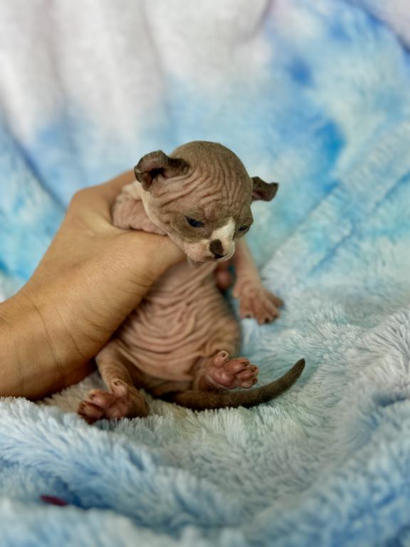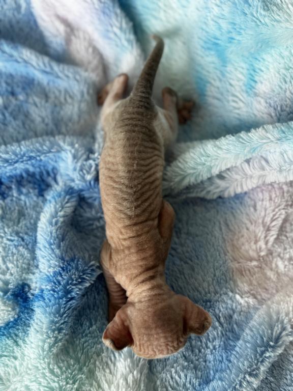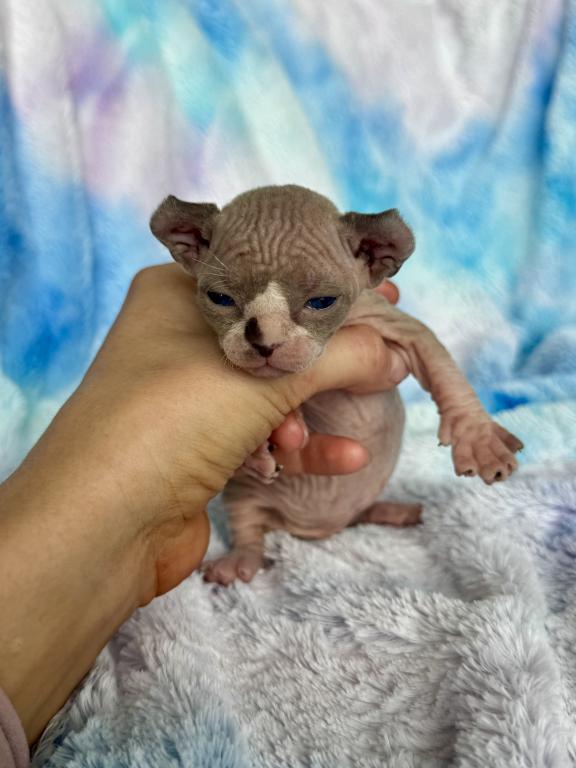 Mochi is an absolutely adorable Sphynx girl who looks just like a little teddy bear. She has a sweet white and chocolate face with a tiny black speck on her nose that adds extra charm. Her elf-like ears give her a playful look, and she carries a unique trait from her mom’s genetics — a very fine, soft coat of hair along her back and tail. This touch of fluff makes Mochi stand out while still showcasing her Sphynx heritage.