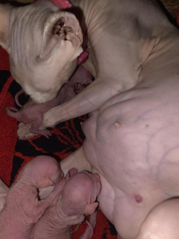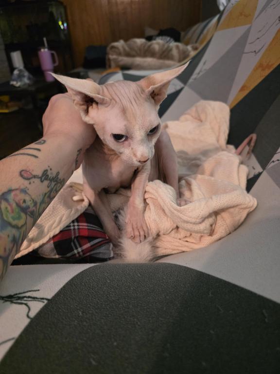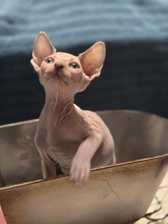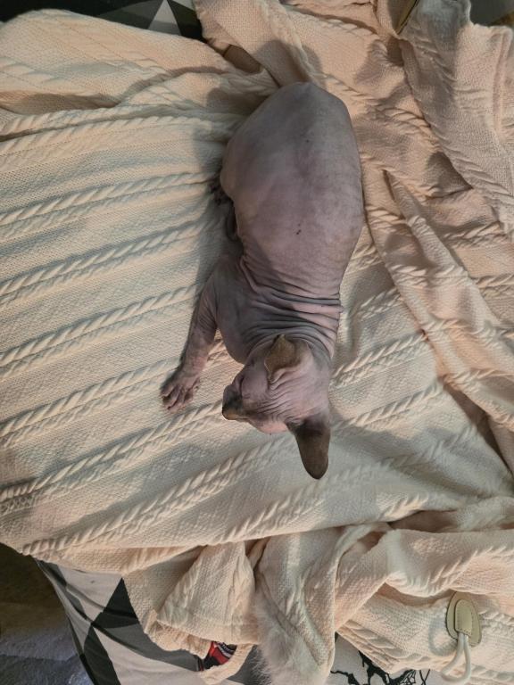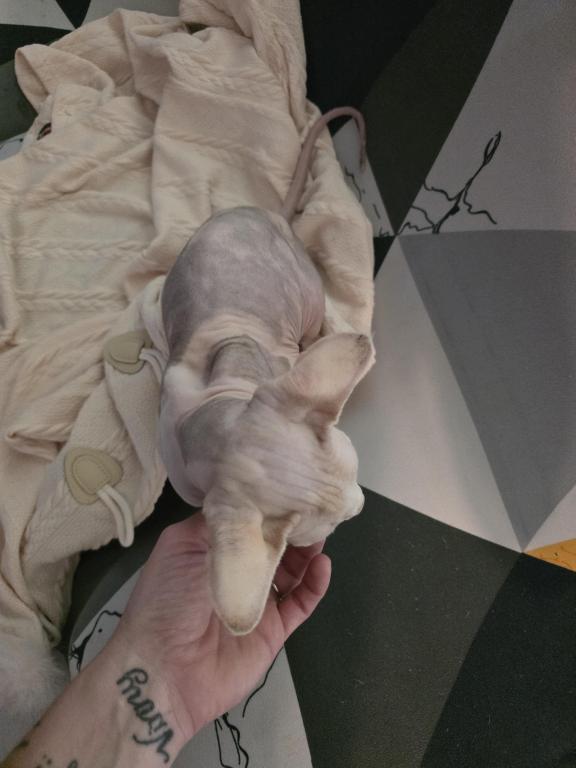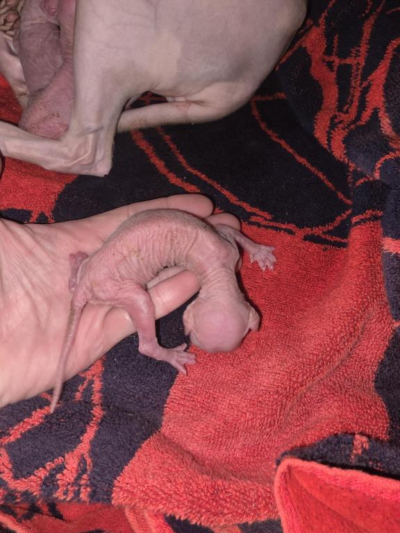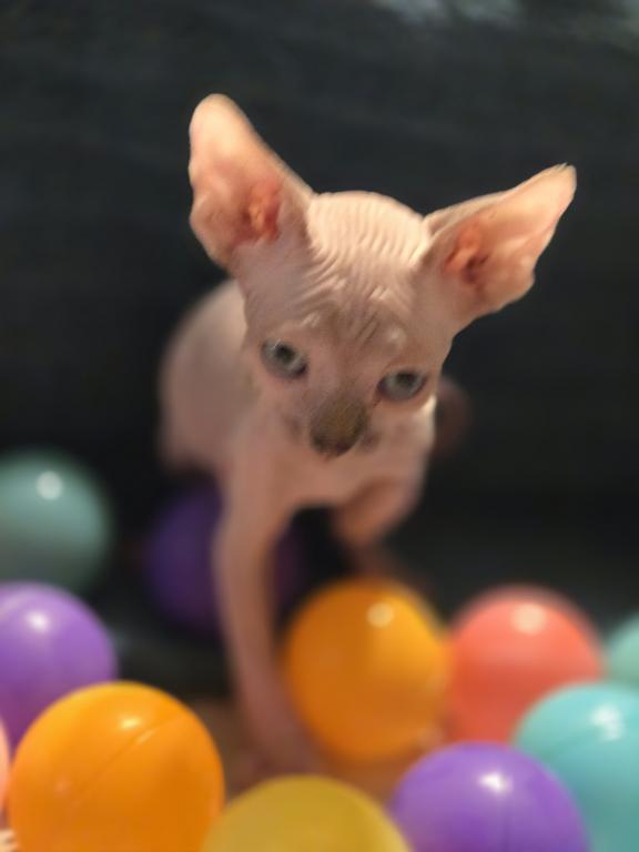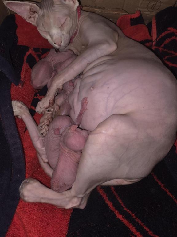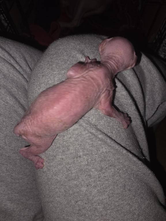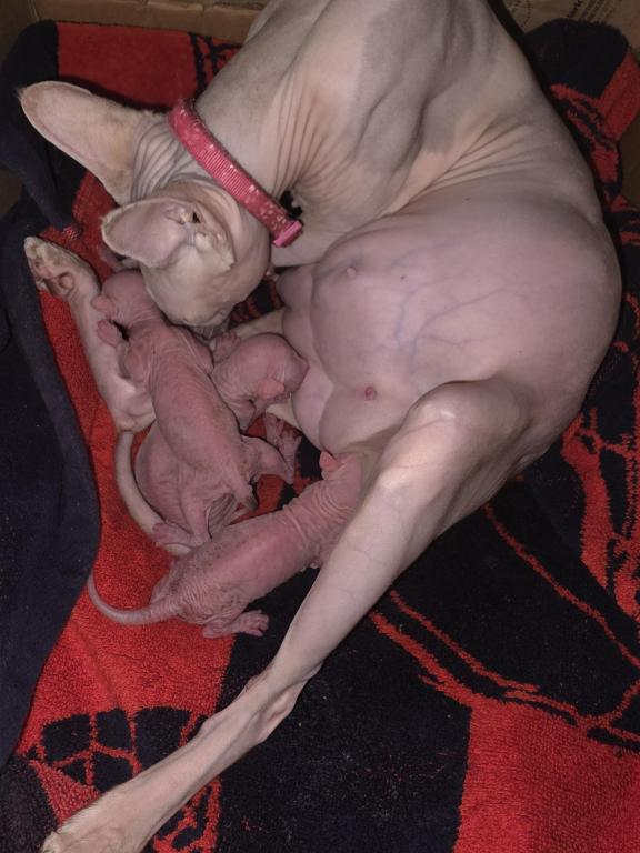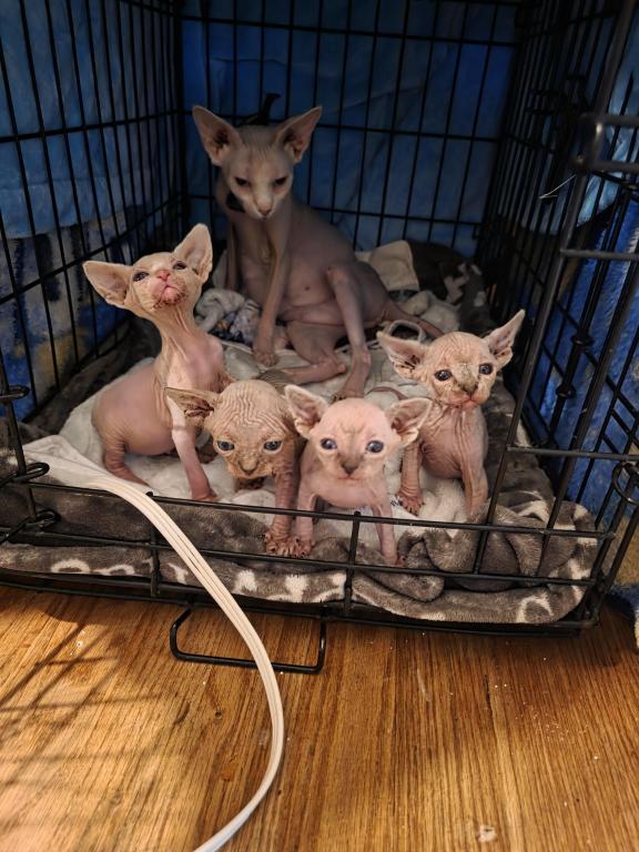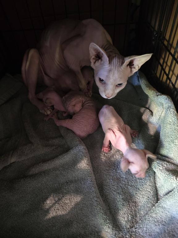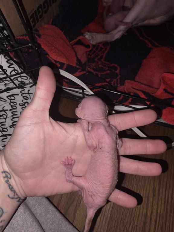 Momma cat is named Dobby the house elf. She is mostly pink/white with some gray spots. Virtually no hair except on nose and very little on feet. Dad is Thomas the train car cat. He is mostly gray with no hair at all. They are both very exceptionally loving and amazing with our children. They come when called and always want snuggles. Easy to bathe too.Kittens are doing amazing! We can't quite see their colors yet as they are all pink. I will upload more pictures as they get older. Right now there are 3 girls and 2 boys available. She gave birth to 7 beautiful babies.