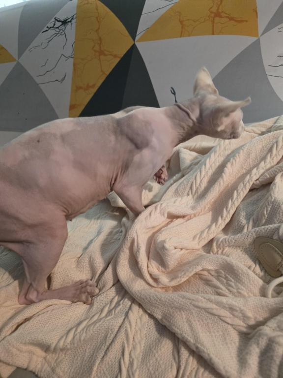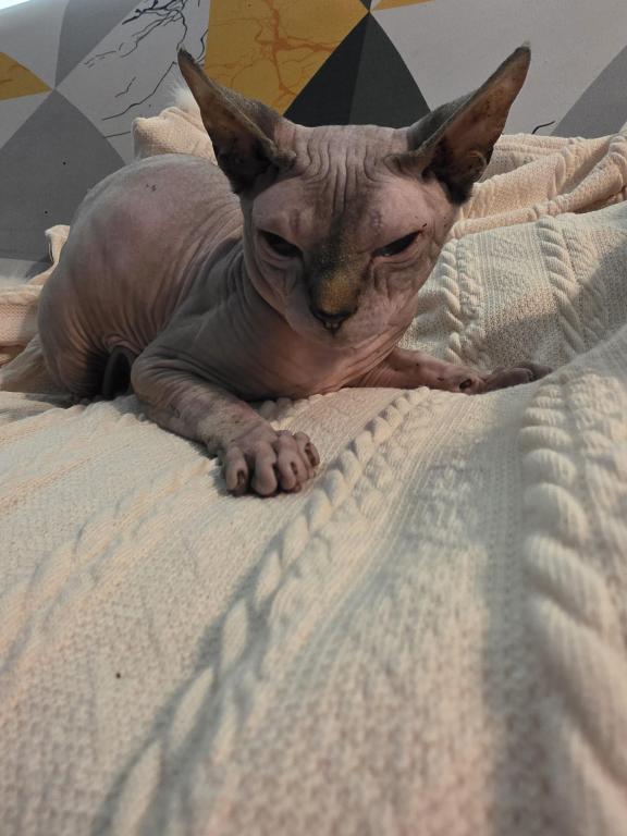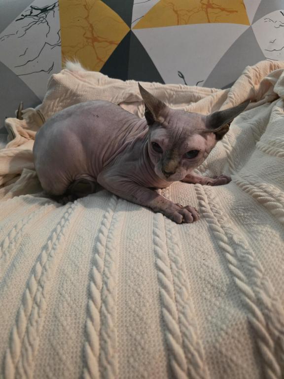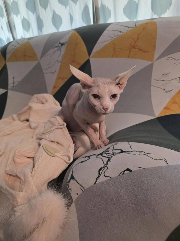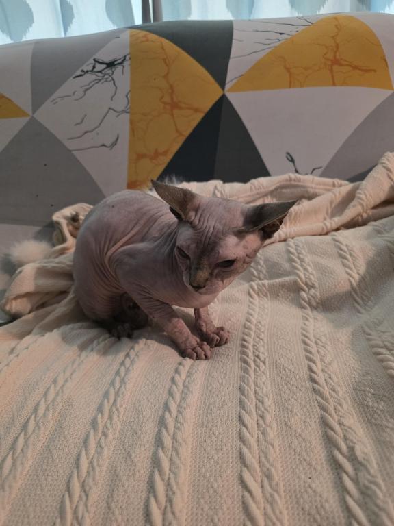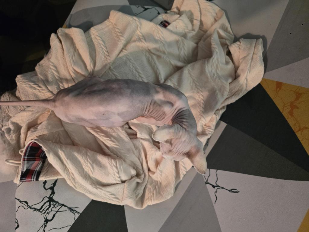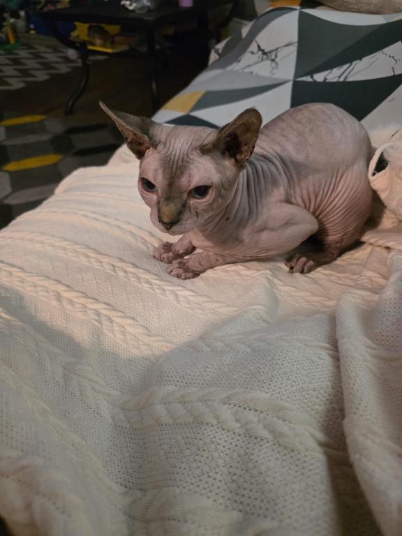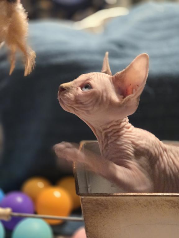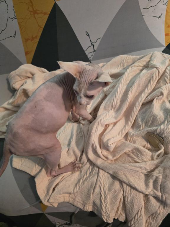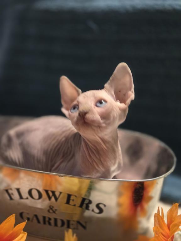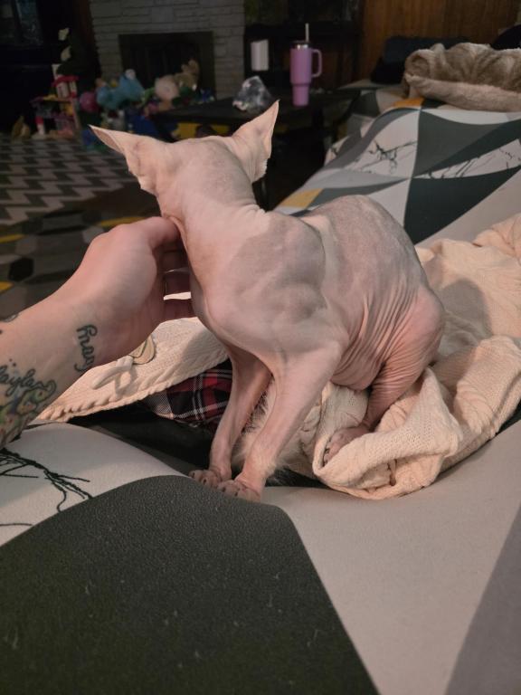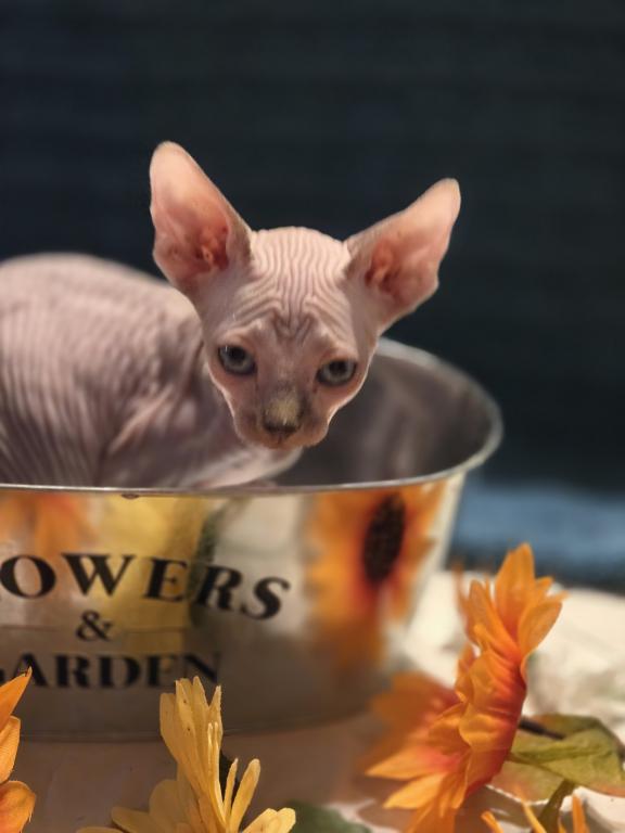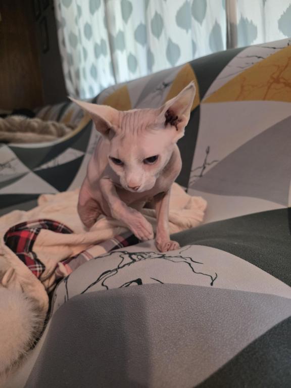 Momma cat is named Dobby the house elf. She is mostly pink/white with some gray spots. Virtually no hair except on nose and very little on feet. Dad is Thomas the train car cat. He is mostly gray with no hair at all. They are both very exceptionally loving and amazing with our children. They come when called and always want snuggles. Easy to bathe too.Kittens are doing amazing! We can't quite see their colors yet as they are all pink. I will upload more pictures as they get older. Right now there are 3 girls and 2 boys available. She gave birth to 7 beautiful babies.