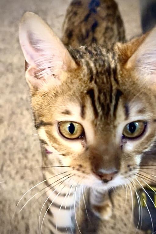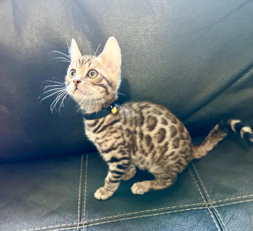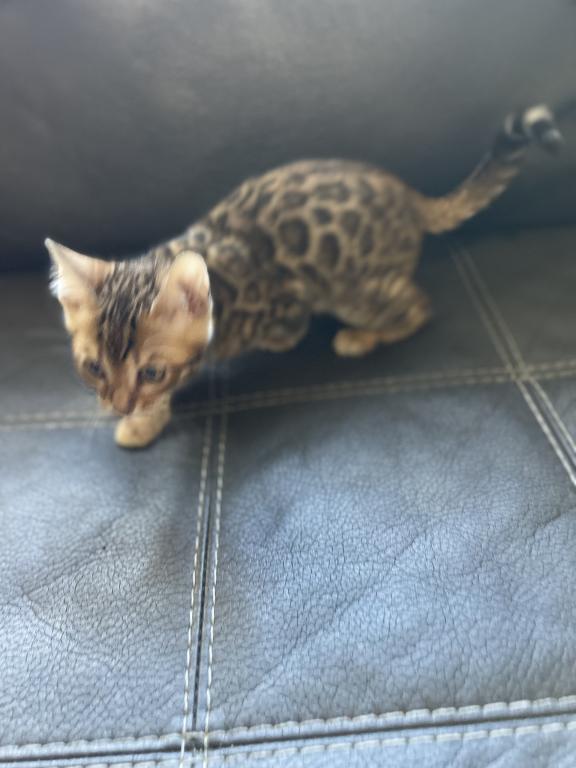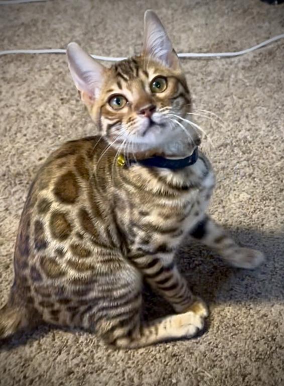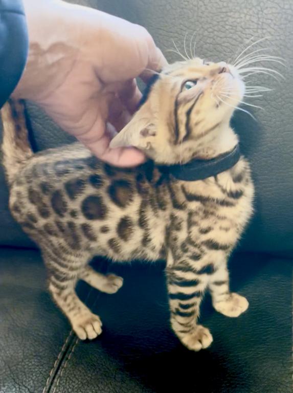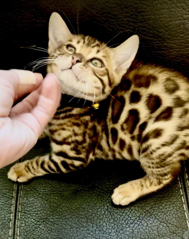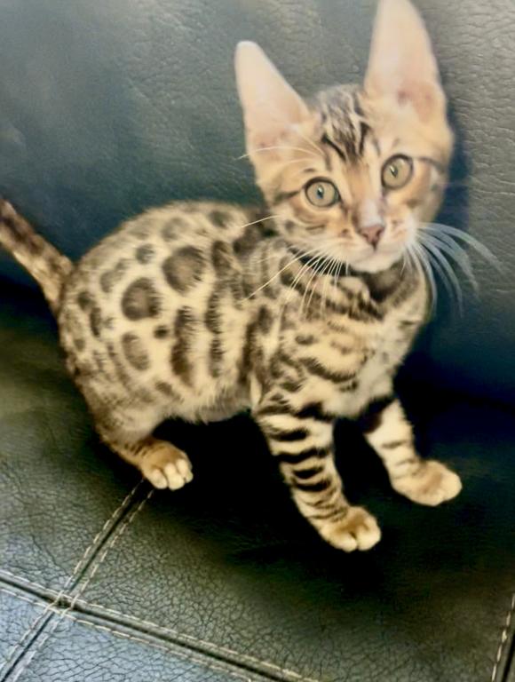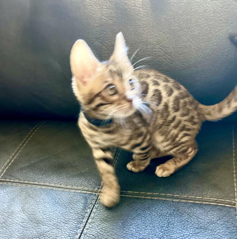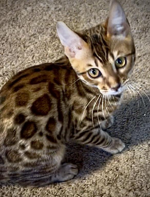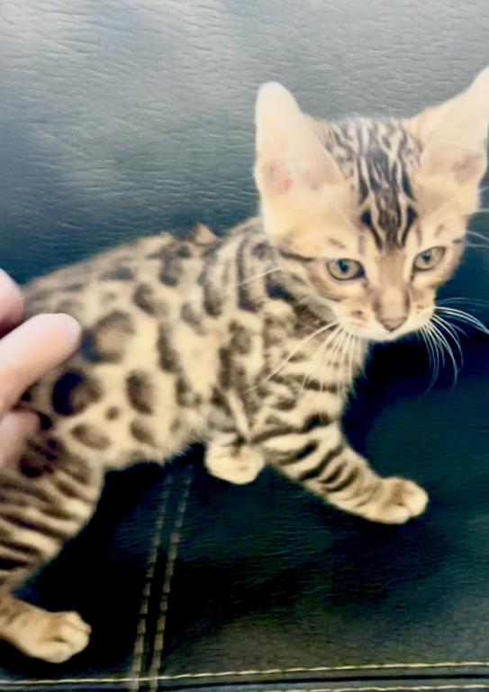 Historia is our shy sweet girl. She will watch her litter mates play and wrestle while she sits and observes. When you pick her up, she’ll start purring immediately. She loves to be held and cuddled. She is around dogs but prefers her humans company. Historia has a very calming nature about her. Her rosettes and coloring is absolutely gorgeous! We were going to keep her to be our next queen. Unfortunately, my health has taken a toll. Historia will make an amazing addition to your family, she is stunning!