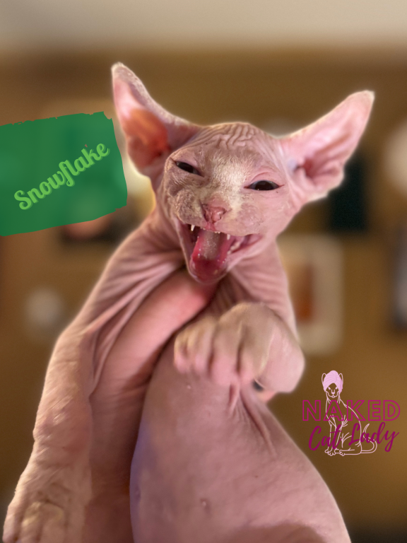 Snowflake is solid white with white furry "socks" and a furry tail. He has STUNNING blue eyes, curled elf ears that get more curly the more excited he is. He is a ball of energy and loves attention! He is going to be a really fun companion.