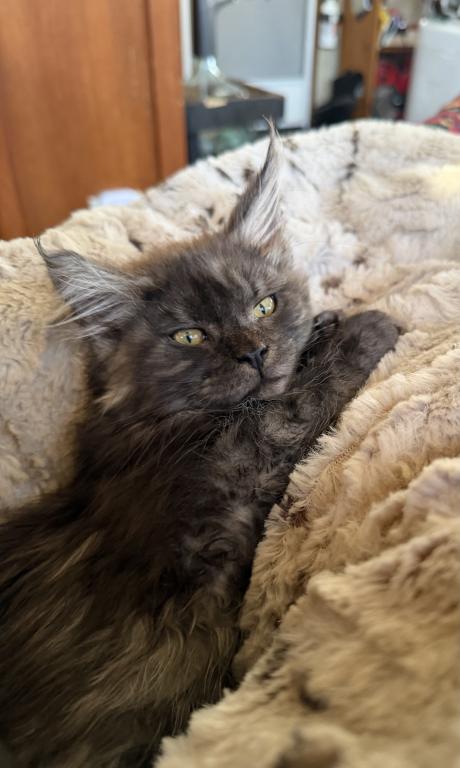 This male is projected to be a large, striking adult with that classic “lion cub” Maine Coon look. His color alone is rare and visually stunning — and paired with health-tested lines, he’s an incredible addition to a breeding program.