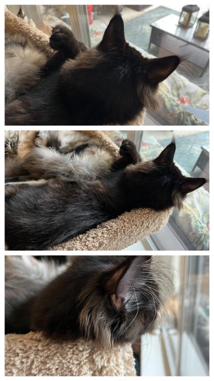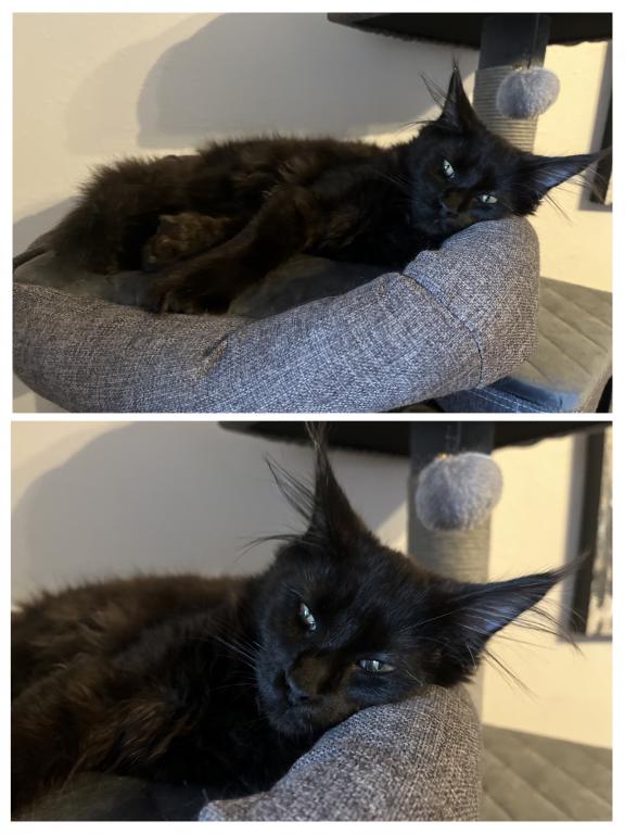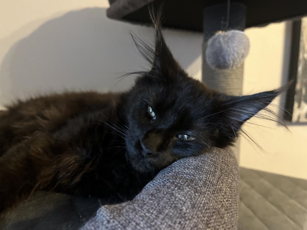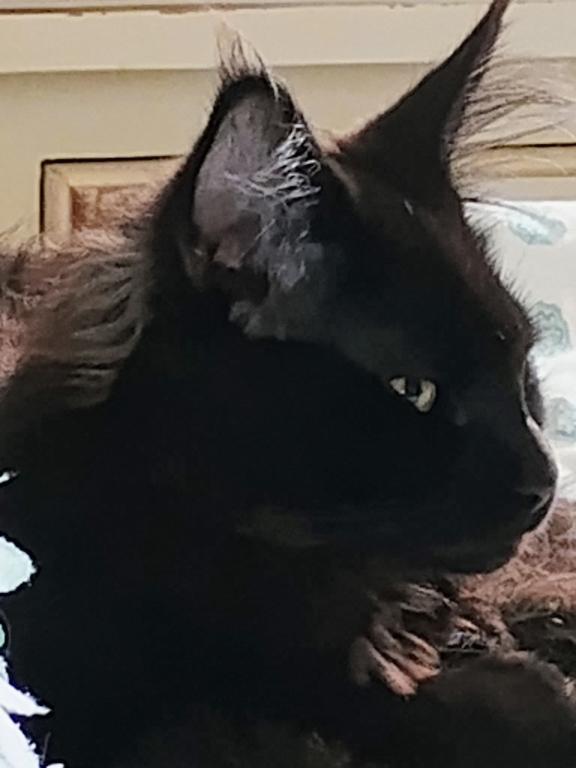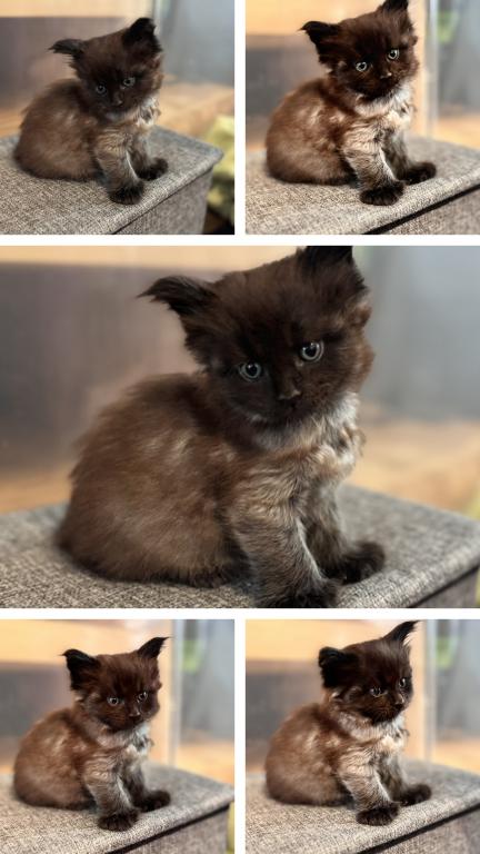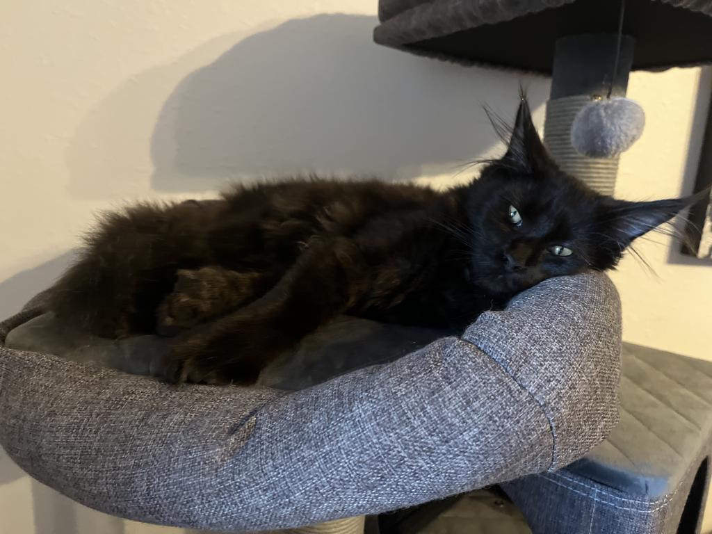 Oreo, our sweet poly (6toes on all 4paws) girl is very observant and is always watching what's going on around her. She likes to explore and climb around her cat trees. We find her grooming her litter mates with love when she plays. We love her cute chirps and trills. Follow us at Kisacoons on Facebook for more info. She's growing more stunning by the day. She looks like a baby panther. :)