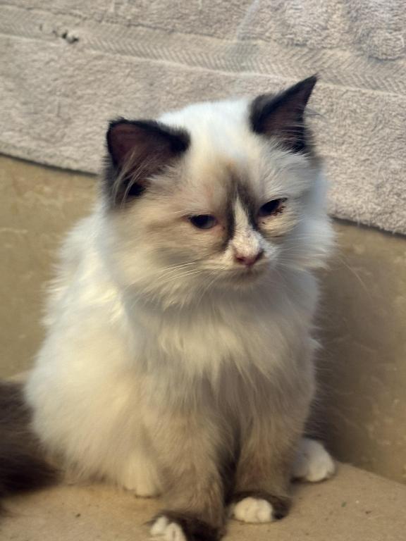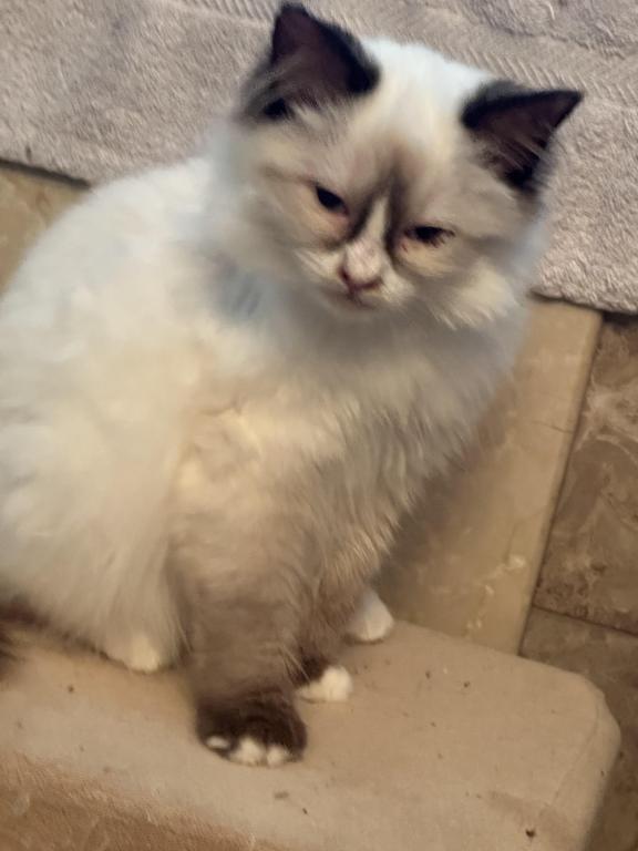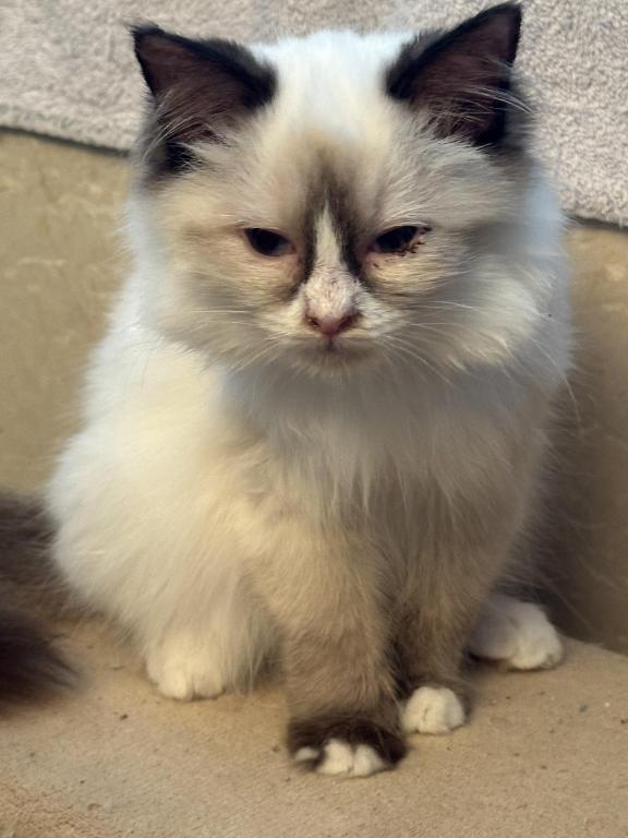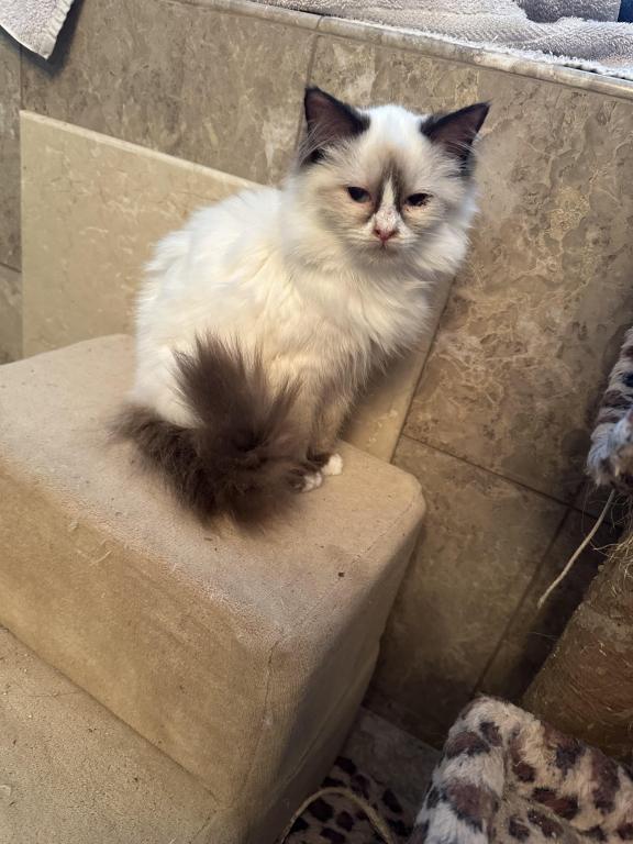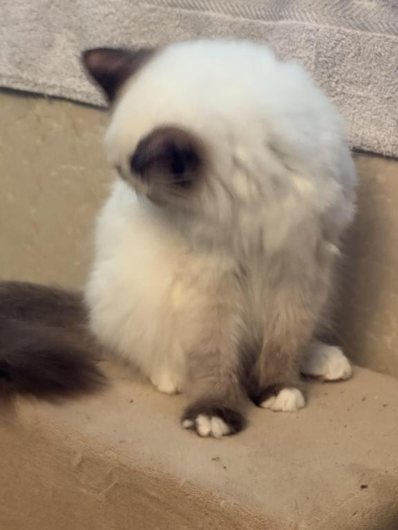 This beautiful little gal is small and dainty either a beautifully marked face with big blue eyes. She is registered in TICA and CFA and conforms to the standard for her breed. She is also negative for HCM. She is a seal point bicolor mitted. Her coat will be long as an adult. She is well mannered and enjoys playing either both other kittens and adult. She has a loving personality and an instant purr when she is held. She loves her licky treats and has a good appetite. She is not bashful when it comes time to eat and is always looking for attention.