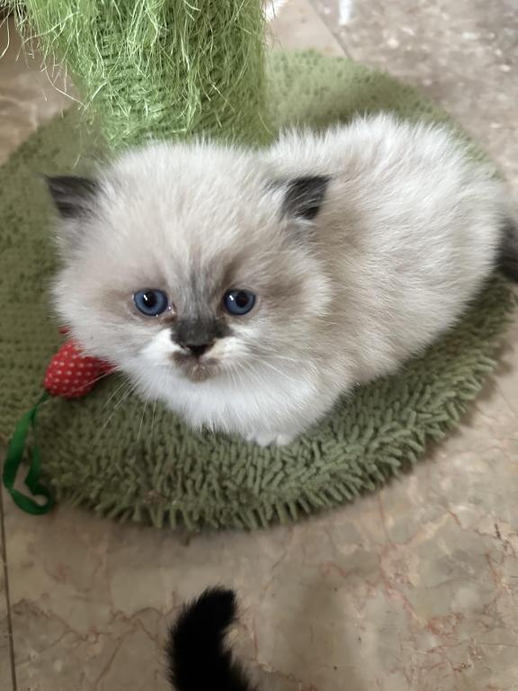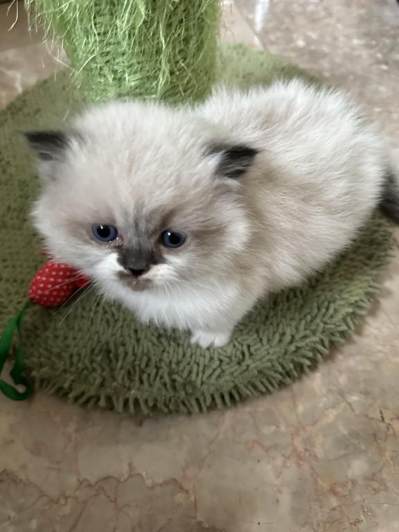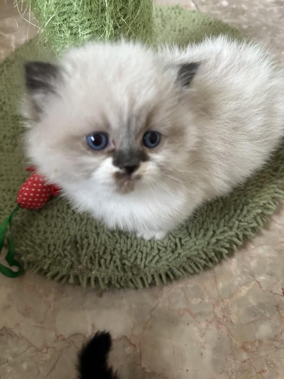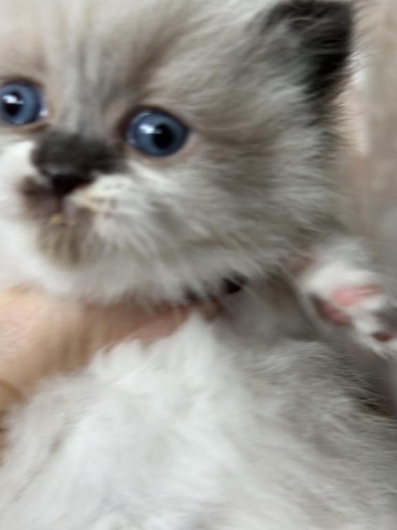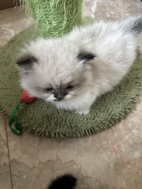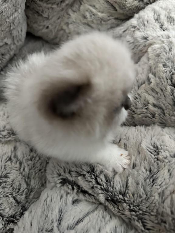 This beautifully marked Standard Munchkin girl is a pointed mitted seal. She has a cute milk mustache and one toe has a seal colored spot. She gets her coloring from her mother who is a seal pointed Himalayan. Her sire is a slow quality standard black and white bicolor. She is very unique with her patterns and coat colors. Her personality is exceptional at this early age having been handled since birth. She loves to have her tummy rubbed and prefers sleeping on her back. She may be small put she can hold her own with her larger siblings.