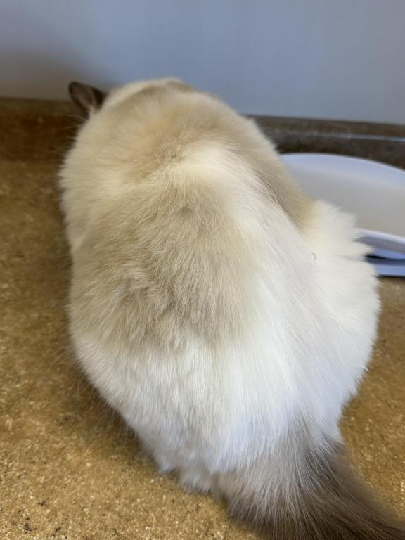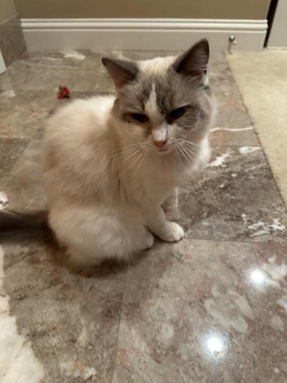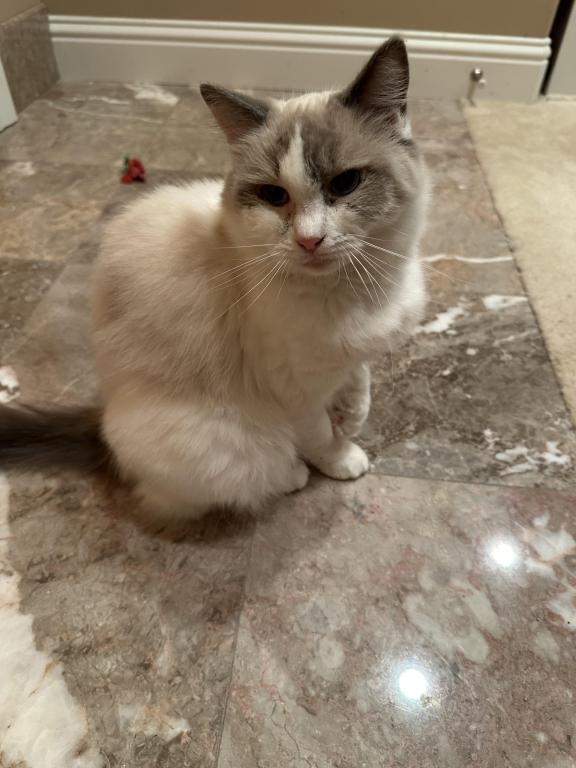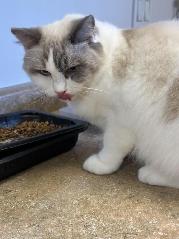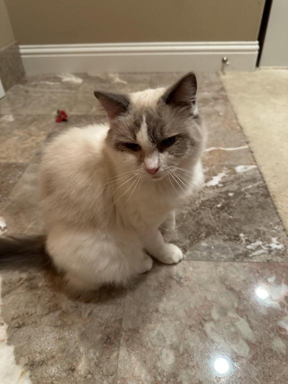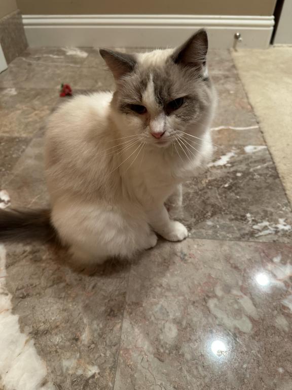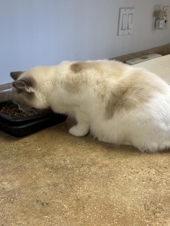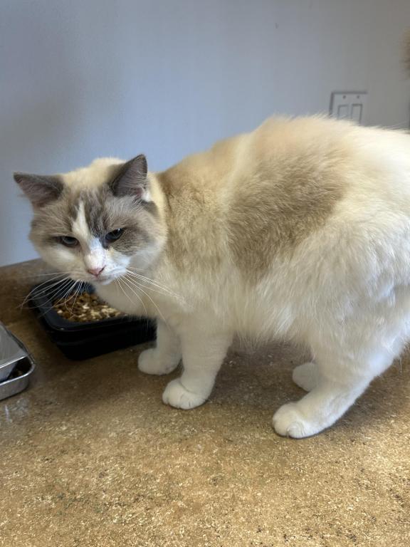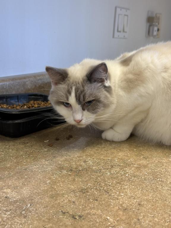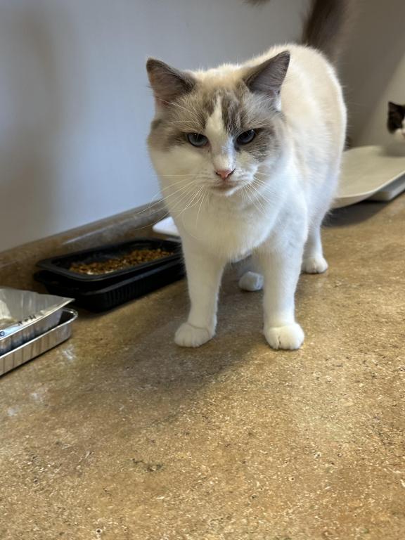 This beautiful girl is a blue bicolor with dark blue eye color. She has a distinctive pattern and very lovely. She has a very affectionate personality and is very sociable and sweet. She interacts well with other cats and kittens. She is currently pregnant and can't be rehomed until her kittens are weaned. She had 5 beautiful kittens on 04/26/2026.