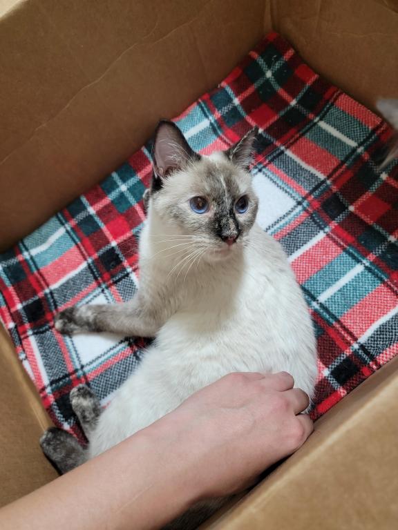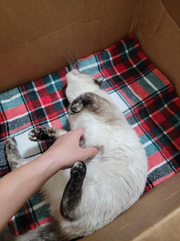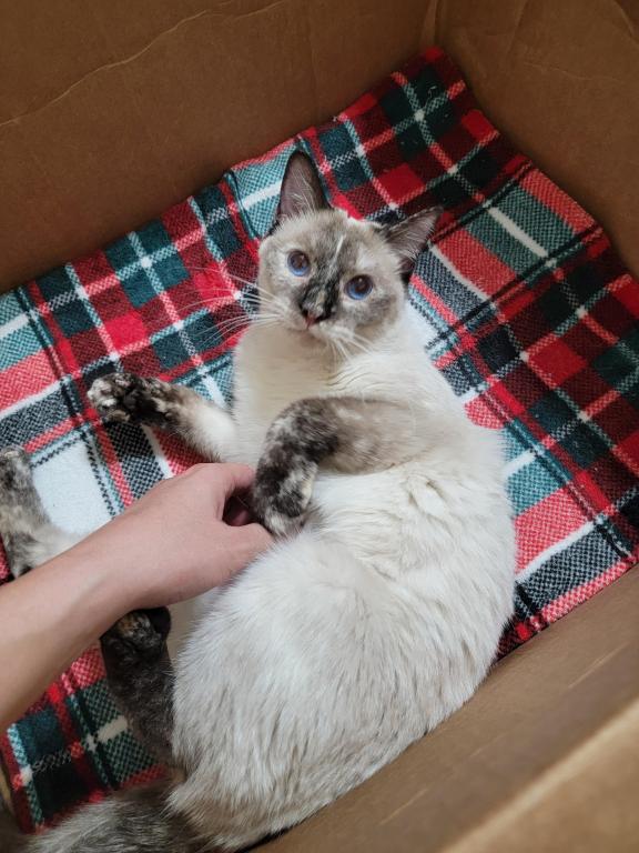 The most sweet and loving cat, she will insert herself in your lap as soon as you sit down. She begs for attention and is talkative when asking. She longs to be near people and should not be a only pet unless you are constantly at home. Vaccination records provided, she is spayed and has all of her shots.