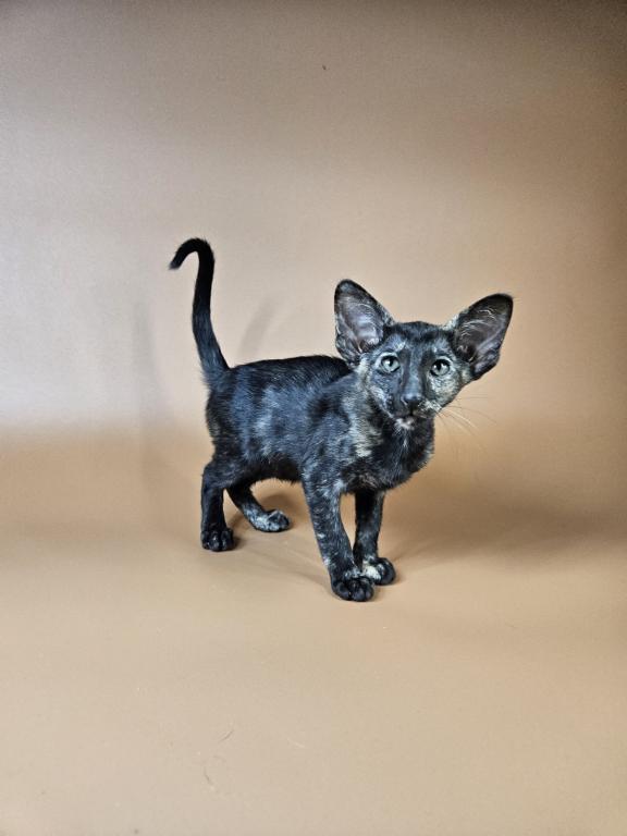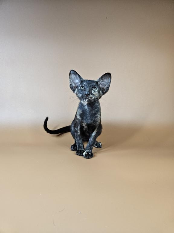 Meet Melanka, an elegant Oriental kitten with a striking coat and large, expressive ears. This kitten is affectionate, playful, and ready to become a loyal family companion.