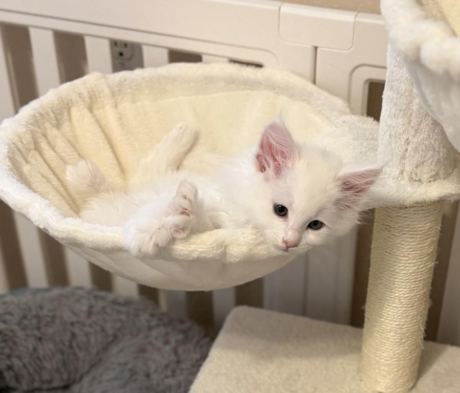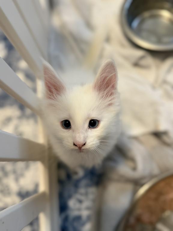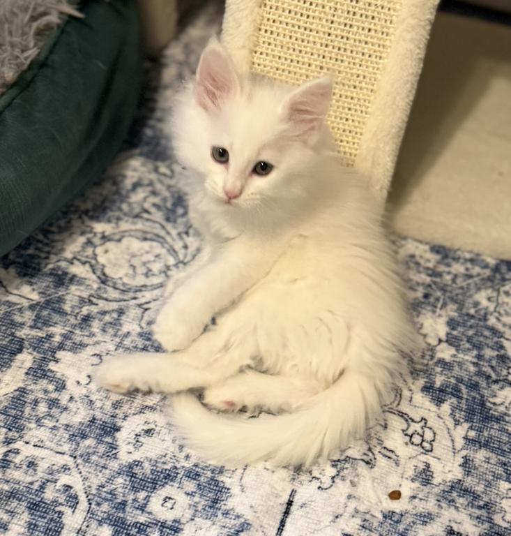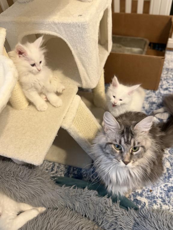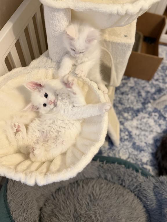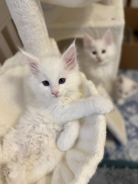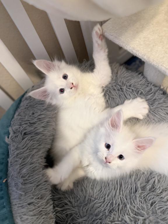 Beautiful Maine Coon kittens available. Friendly and Playful. 2 Kittens are solid white male and female with a light brush of black on top of head and one is solid white male with blue eyes. They love to lay around and play on their cat tree. They are loving and enjoy their belly scratched.