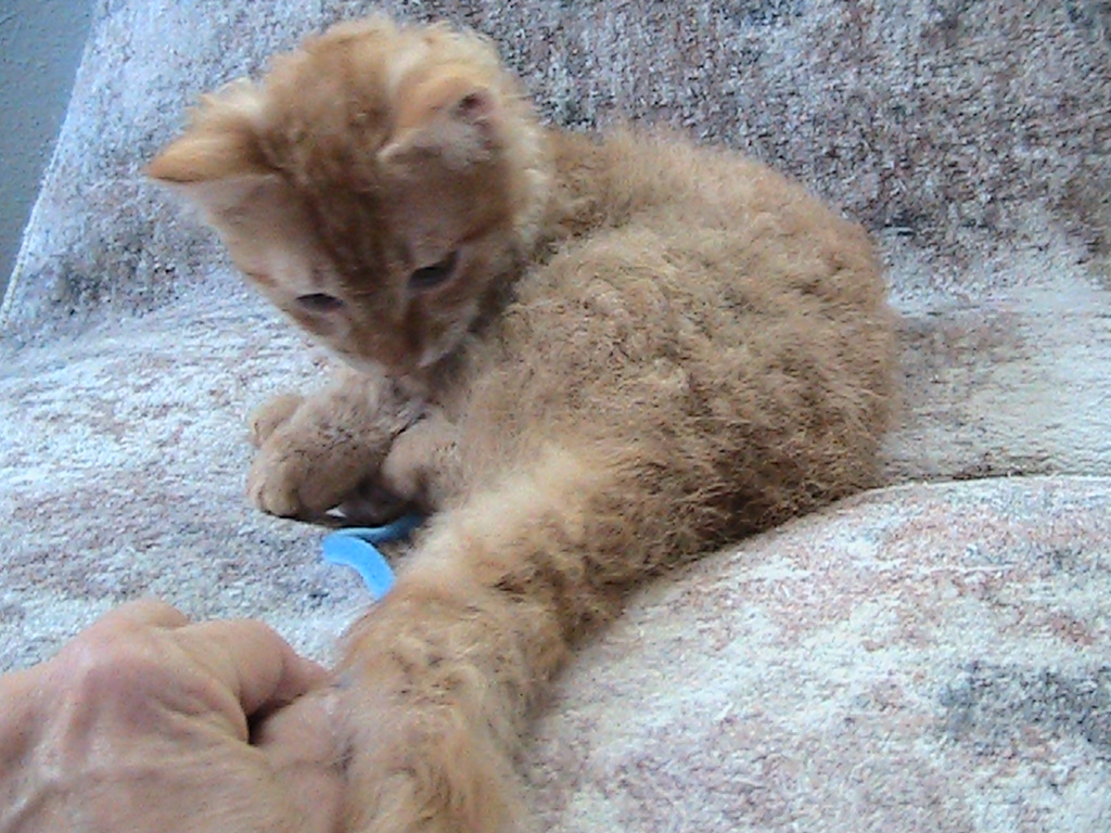 Curly, short-legged Skookum kitten. This litter has both boys and girls and they are ready for their new homes. Dalton always comes to greet me, and he wants to know what I'm doing. He's a great little buddy, and he loves to play!