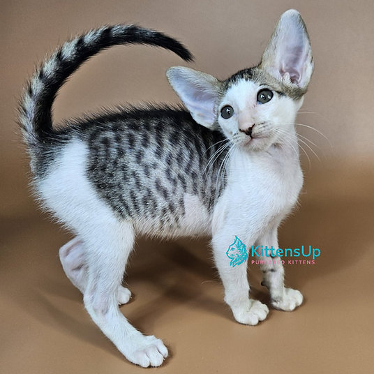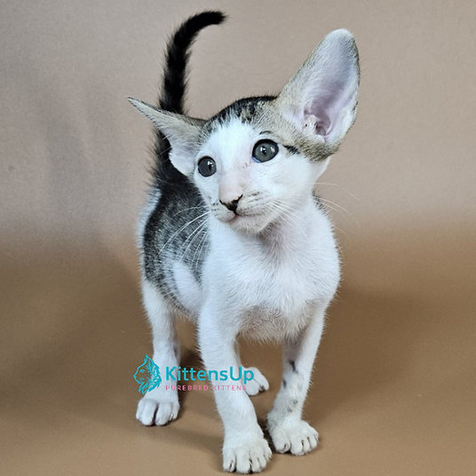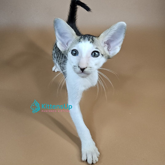Meet Ophelia, an elegant Oriental kitten with a striking coat and large, expressive ears. This kitten is affectionate, playful, and ready to become a loyal family companion.