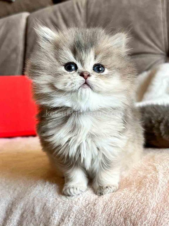 With her signature "Cheshire" face, Kivi boasts an extra-chunky build, wonderfully full cheeks, and a sweet, permanent smile that is simply irresistible. Her magnificent, fluffy coat makes her look like a living pom-pom, while her baby-blue eyes will soon develop into a deep, mesmerizing green, making her round face even more expressive.