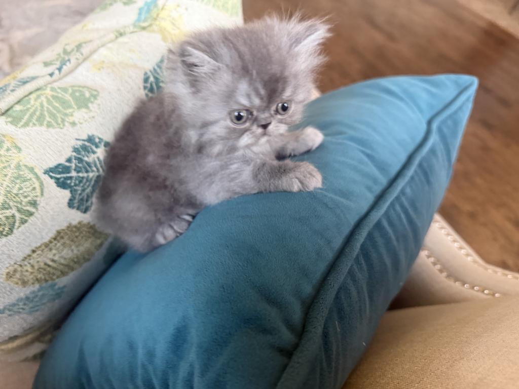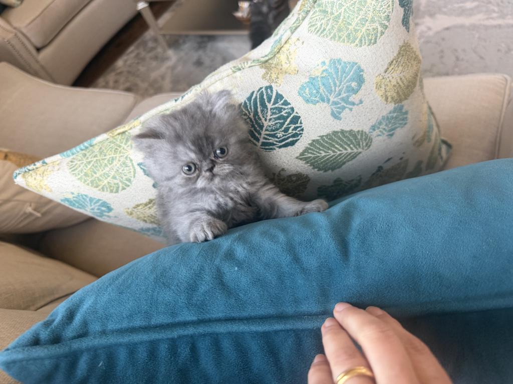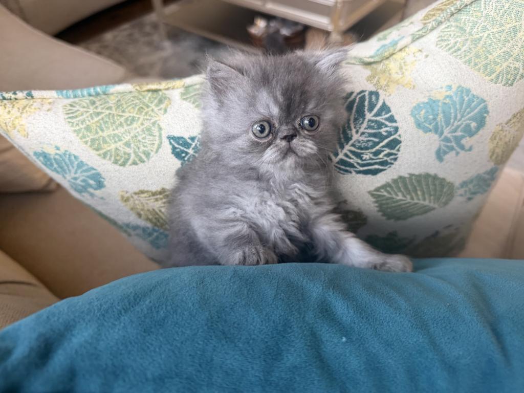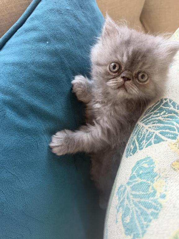 This adorable Persian cat kitten has a soft smoky-gray fluffy coat, round curious eyes, and a tiny flat face that gives it a sweet, slightly grumpy expression. Its thick fur, chubby little paws, and plush body make it look like a tiny cloud of fluff, full of charm and personality.