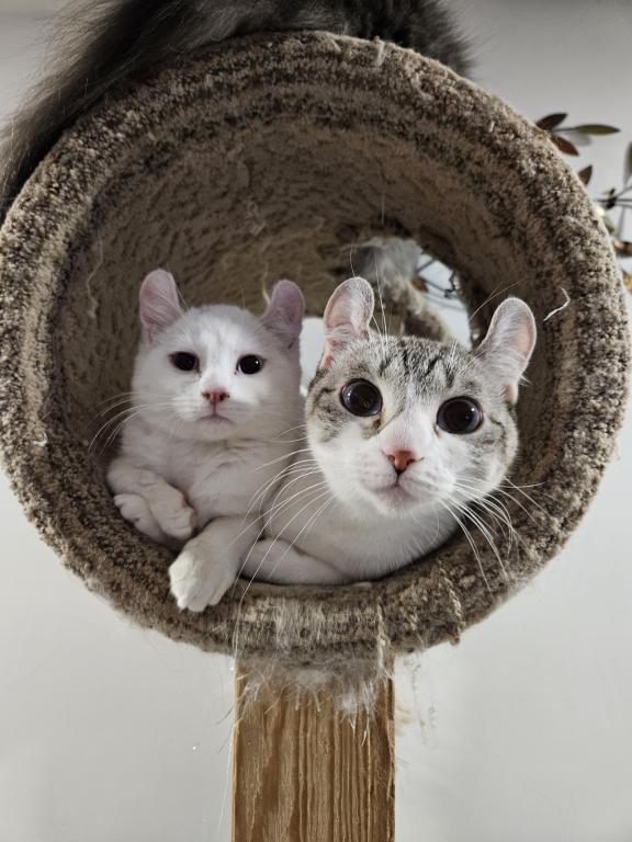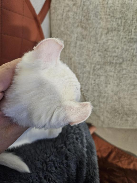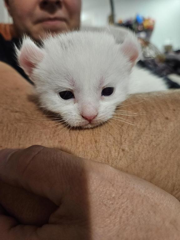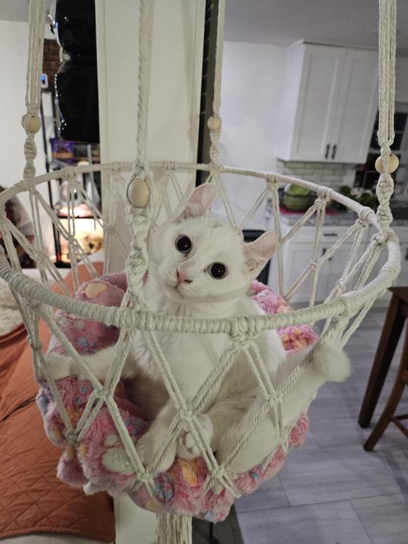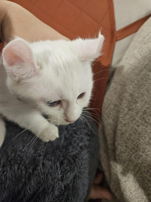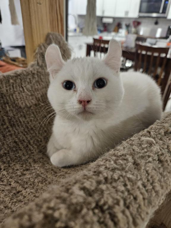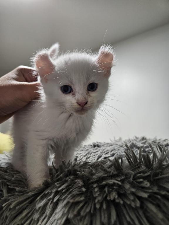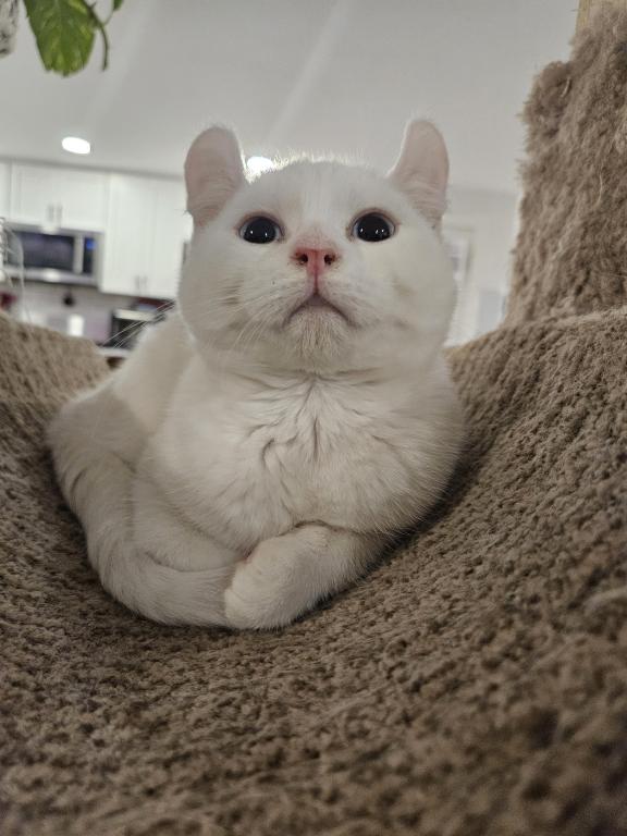 Macy is a quiet girl, that mostly keeps to herself but does enjoy playing with the other kittens. Shes a beautiful white with a slight grey smudge on her head which will likely disappear with age, and blue eyes. She has the classic highlander curled ears.