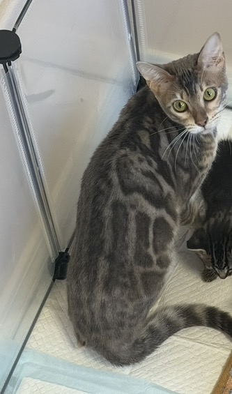 Silva is a very shy and curious little girl. she has beautiful rosettes! she loves having a freind to play with, so it would be great if she had another kitty around her. she’s 11 months old and she does so well with little kittens! she loves playing with them and pretending to be their mama, so cute.