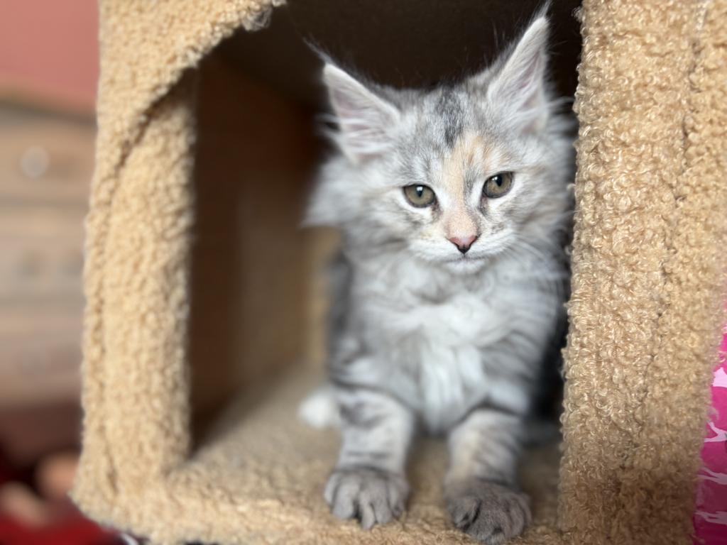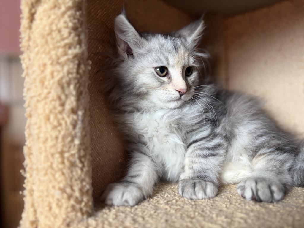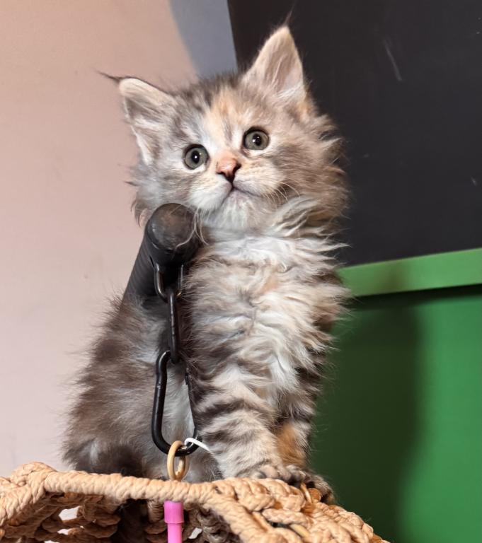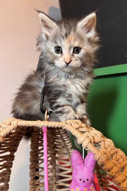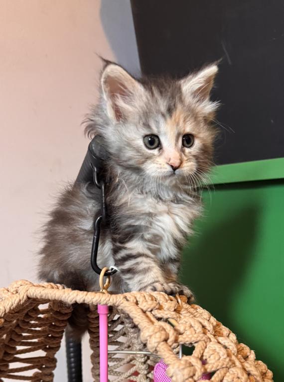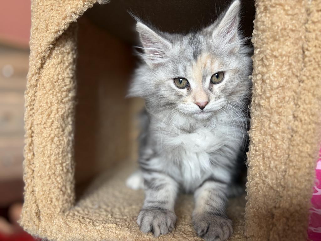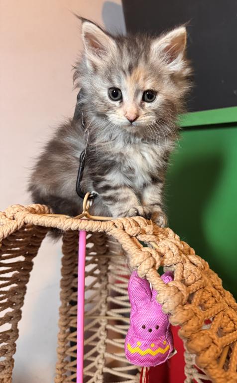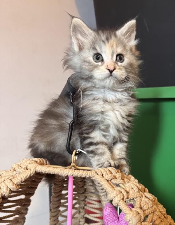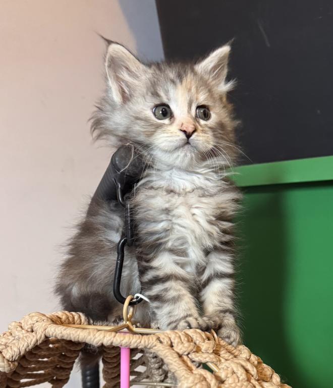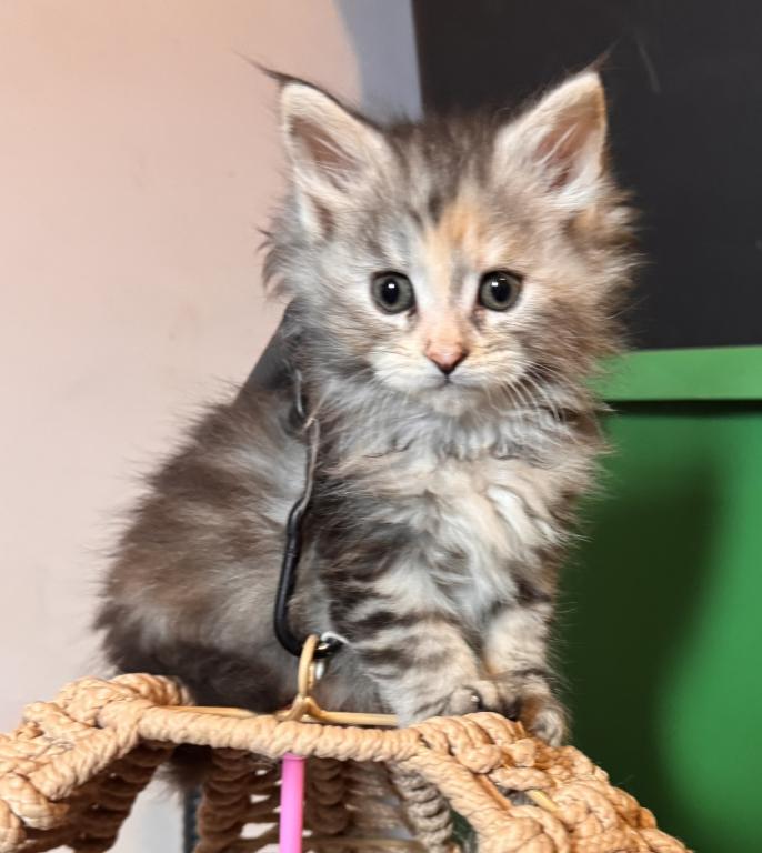 This beautiful little Tortie girl is ready to find her forever home. She has a loving, playful personality. Her mother is Siberian and her father is a MaineCoon. Please contact me for more information, pictures and videos.