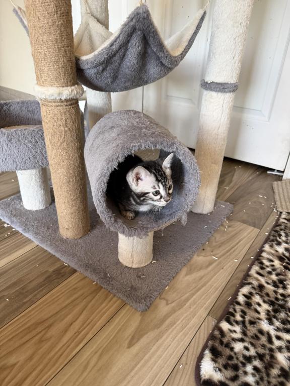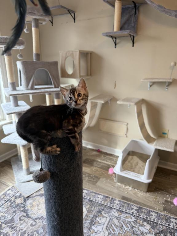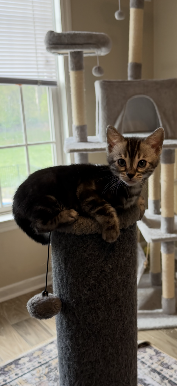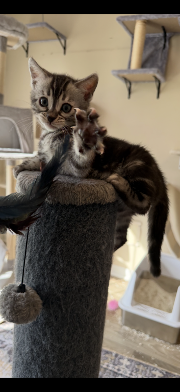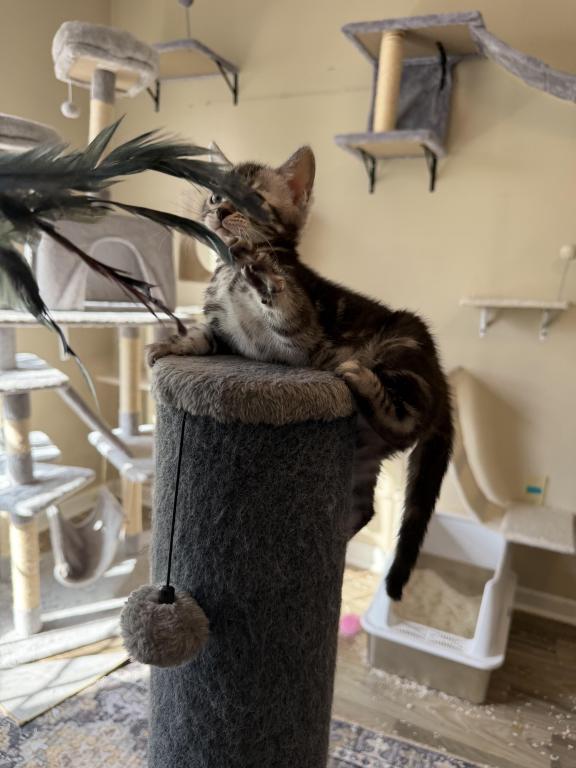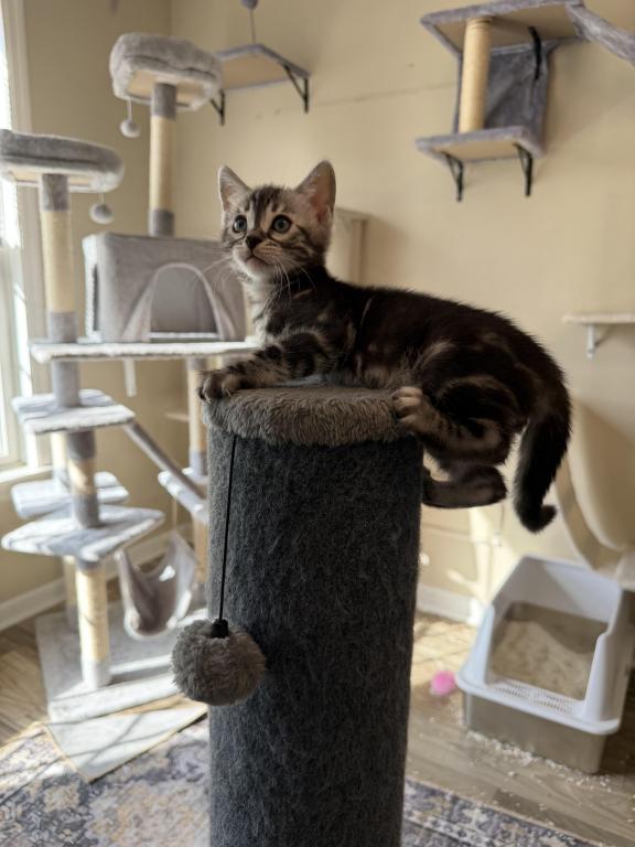 This is a beautiful silver charcoal female kitten. The kitten presently is 8 weeks old on 4/2102026. You may come and visit the kittens anytime after four weeks of age . The father has champion bloodlines from Russia. The mother is also an import from Canada. Both parents are extremely friendly and healthy. This loving kitten can be sold as a pet or Breeder . This kitten is raised in my home with love and affection. I am a TICA registered Cattery. My name is Alison Wilkins and I reside in Reinholds, Pennsylvania. The name of my Cattery is Cool Breeze Bengals. Shipping is available at buyers expense whether permitted. Feel free to call or text me at +1 (484) 388-9010.