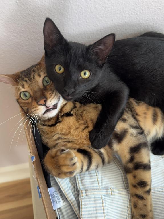 Very sweet and loves to play. Doesn’t like my female cat. Plays with his old brother and cuddles with him.