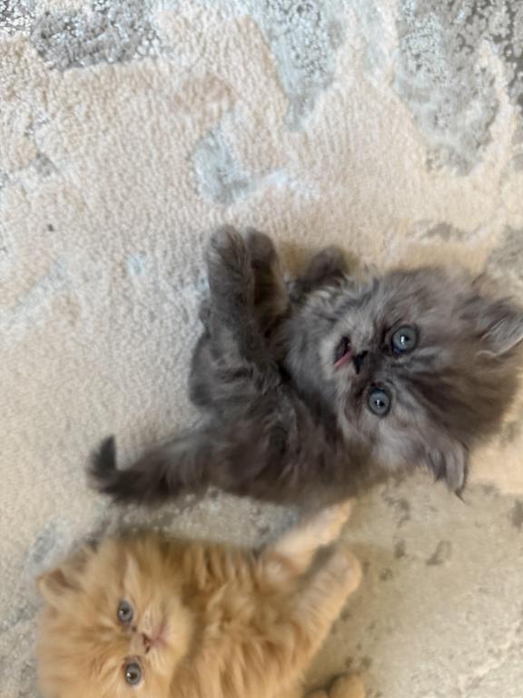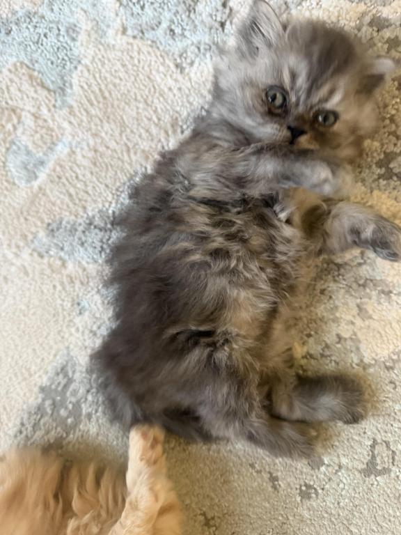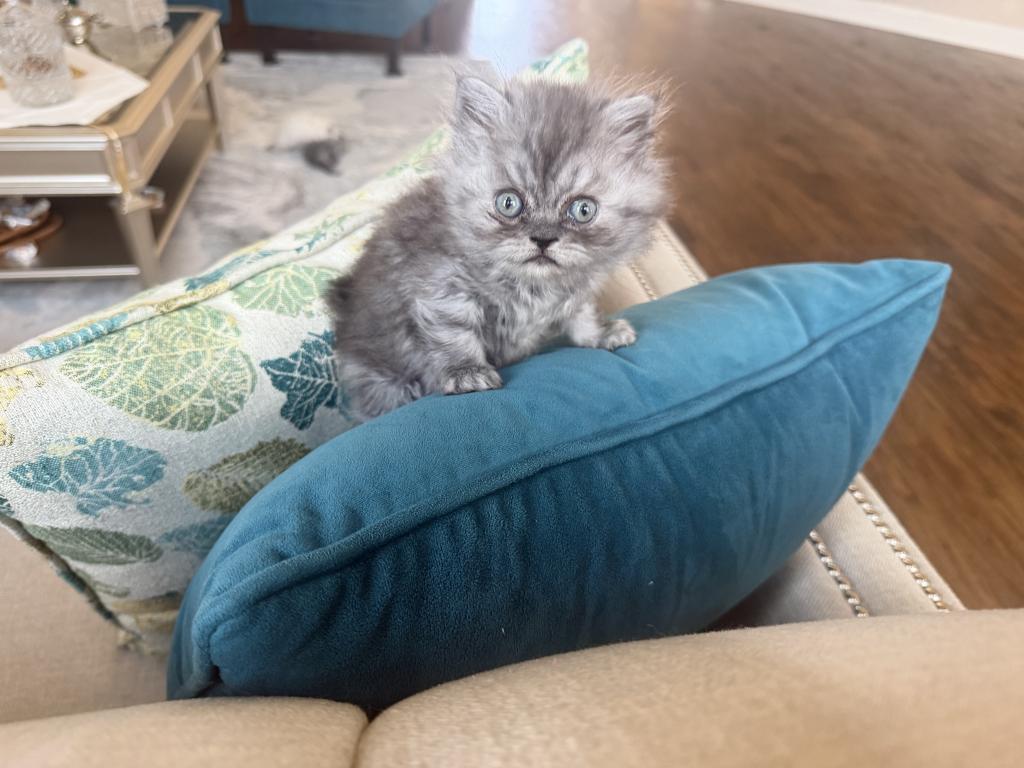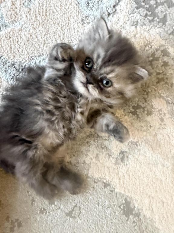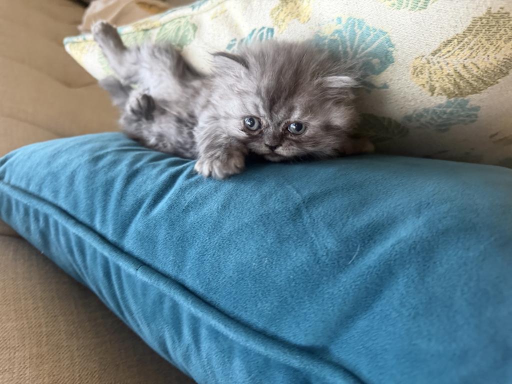 A tiny ball of fluff peeking over the pillow, with soft gray fur and gentle, curious eyes—small, calm, and quietly melting your heart.