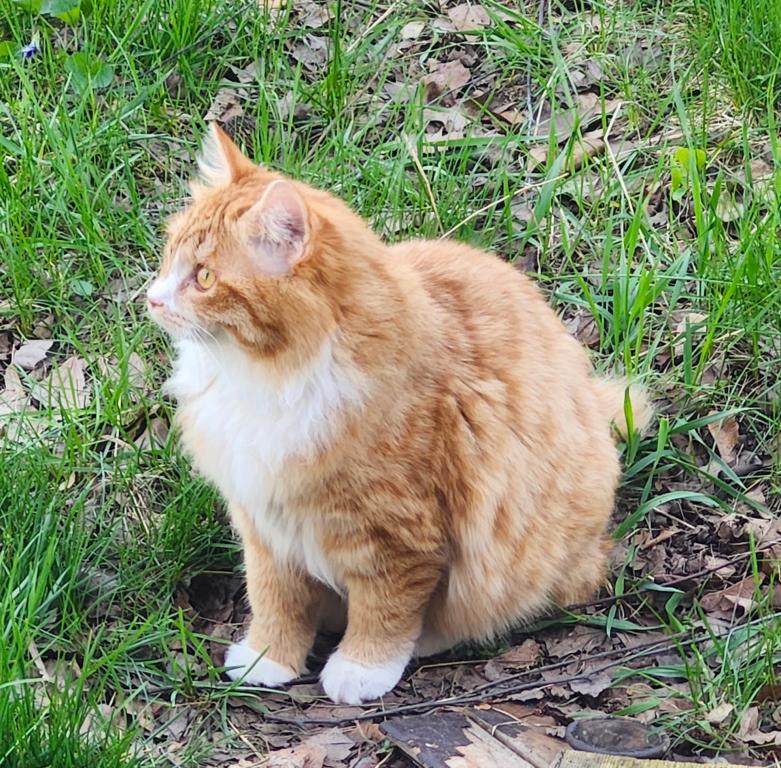 Lala has white socks and a white throat. She's a very sweet and playful kitty, and though she's smaller than her brother, she doesn't hesitate to ambush him and have a play fight which she often "wins."