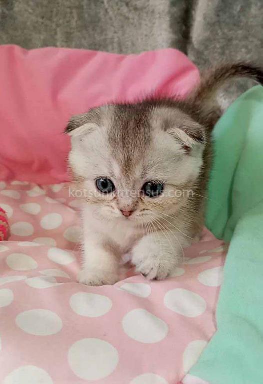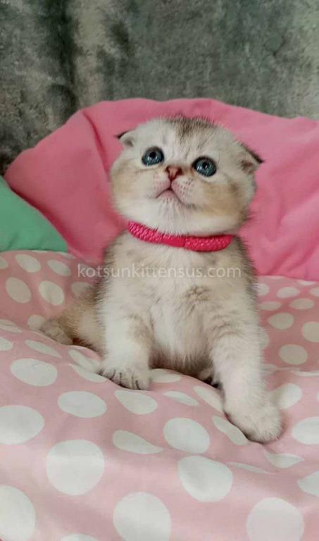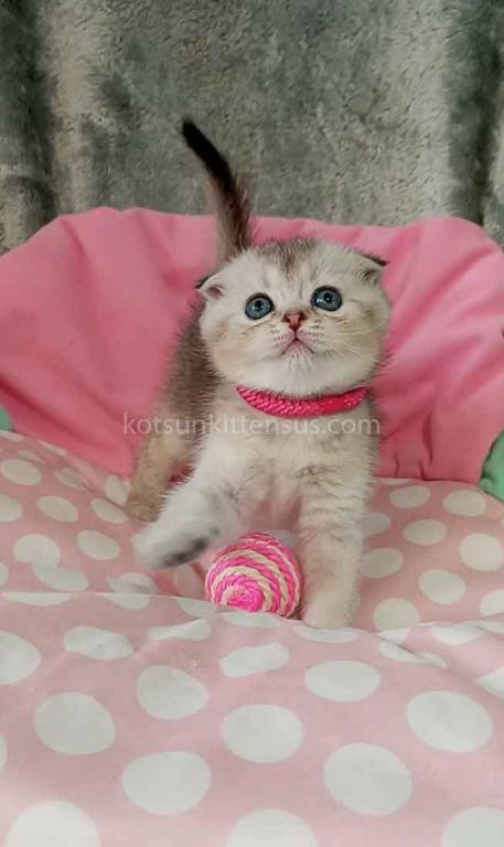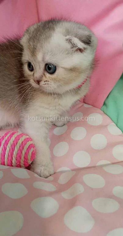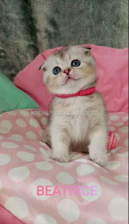Beatrice’s folded ears, chunky cheeks, and plush, dense coat give her a true Scottish Fold charm. Her large, expressive eyes are framed by natural "eyeliner" markings that highlight her sweet face and soft, soulful look.