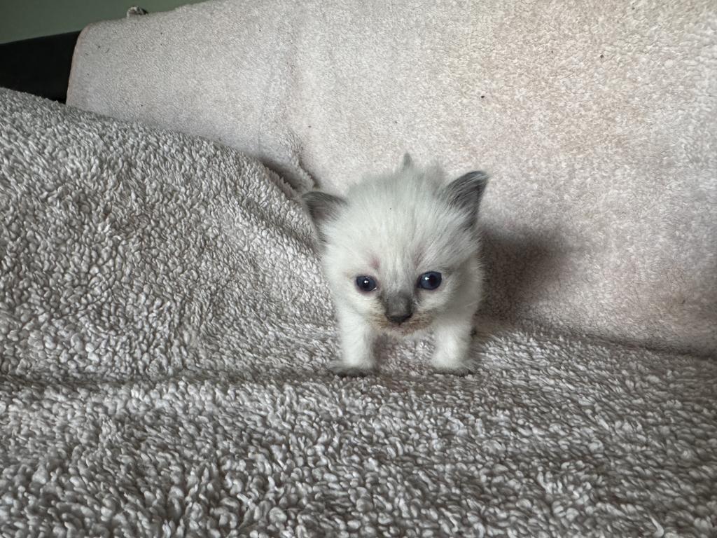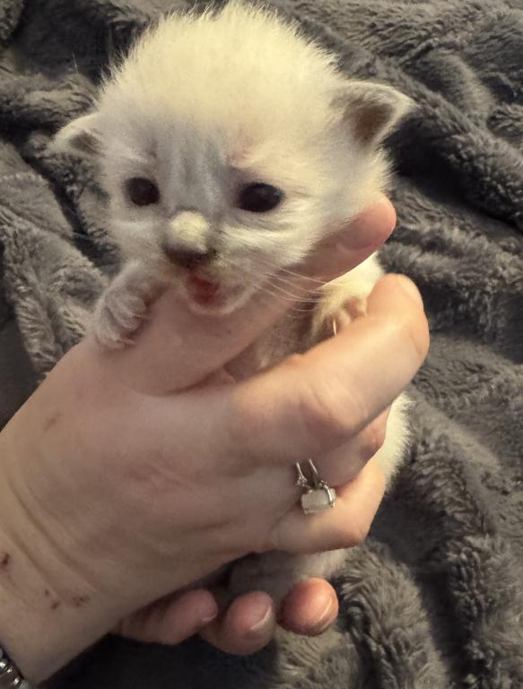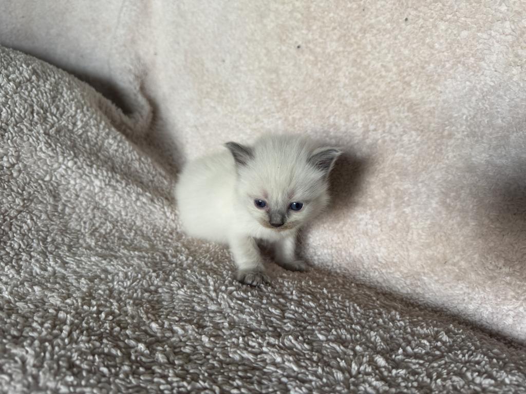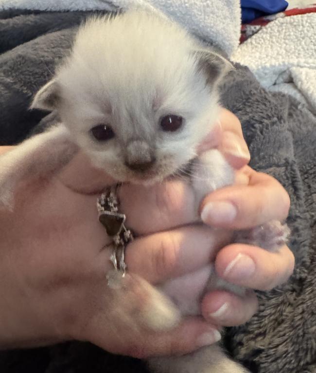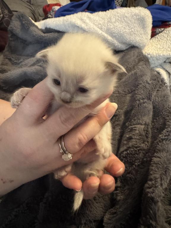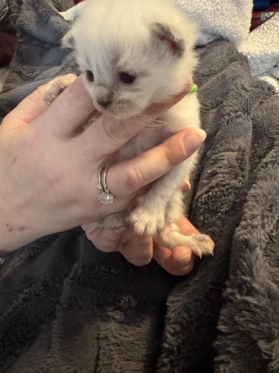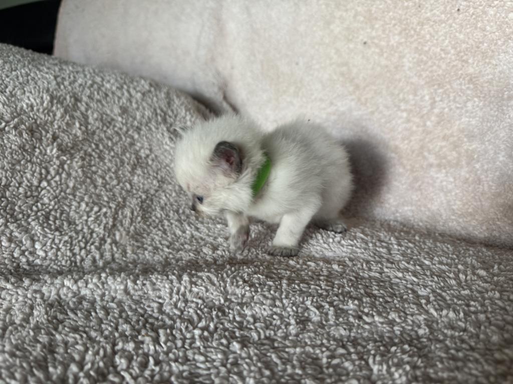 Green Collar (name coming soon) is a Blue Point/Mink kitten. Mom is a Mink and Dad is Blue Point Mitted. All of our kittens are raised to be household pets and are quite familiar with dogs other cats and kids. His coloring is mostly white, with darker blue points on his nose and ears. We would be happy to answer any questions you may have about him as well as provide more photos or videos if required. We do require a $100 deposit to hold your kitten until he is ready, however we would be happy to FaceTime or do another type of video call (Teams, Zoom, etc.) with the kitty to verify he does in fact exist and this is not a scam.