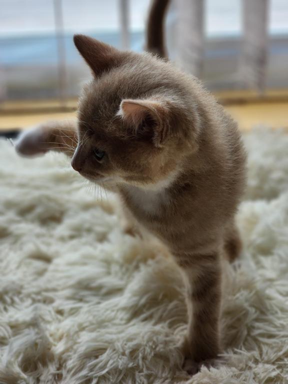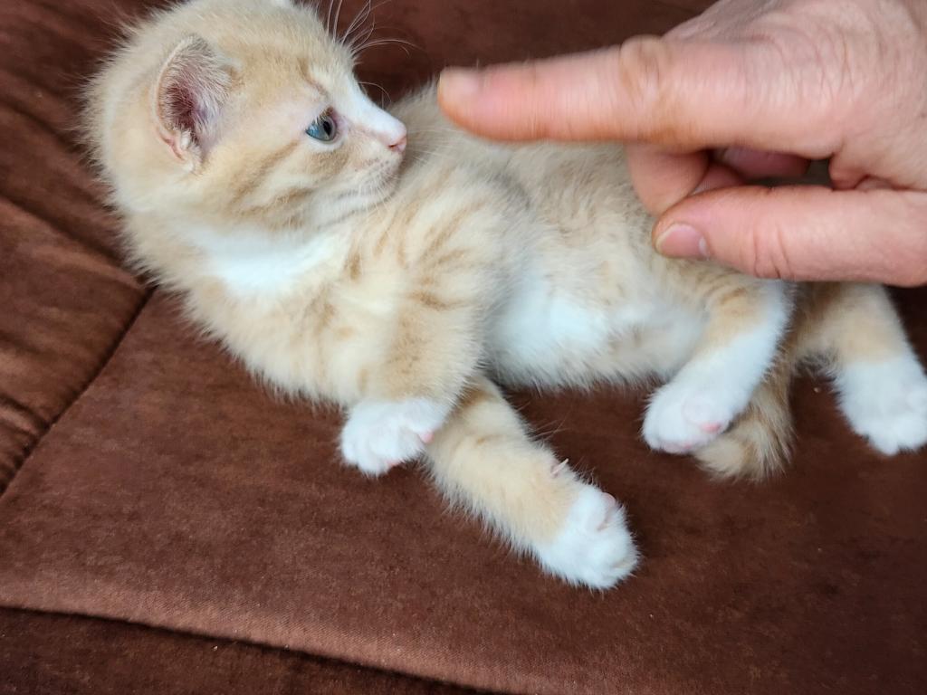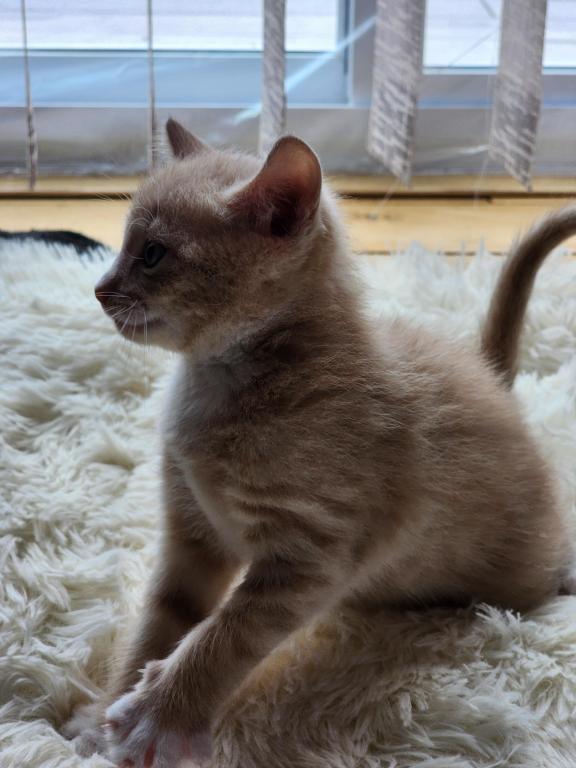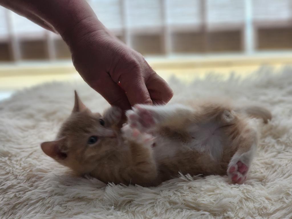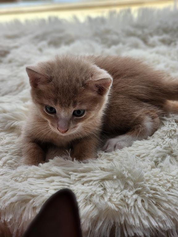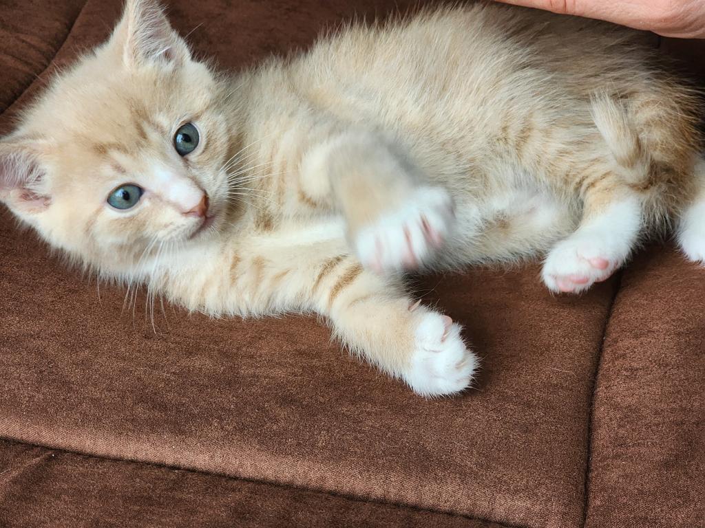 Kitten is litter trained, playful, eats soft and hard foods, and likes to cuddle.