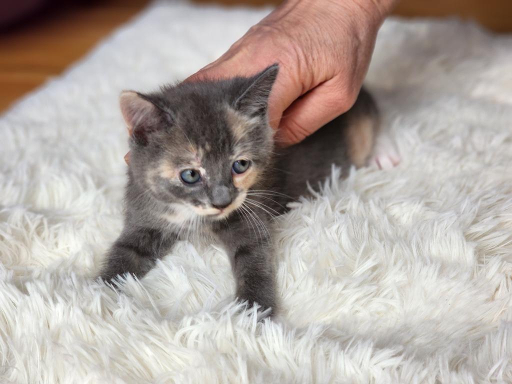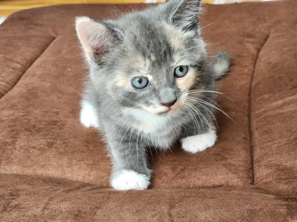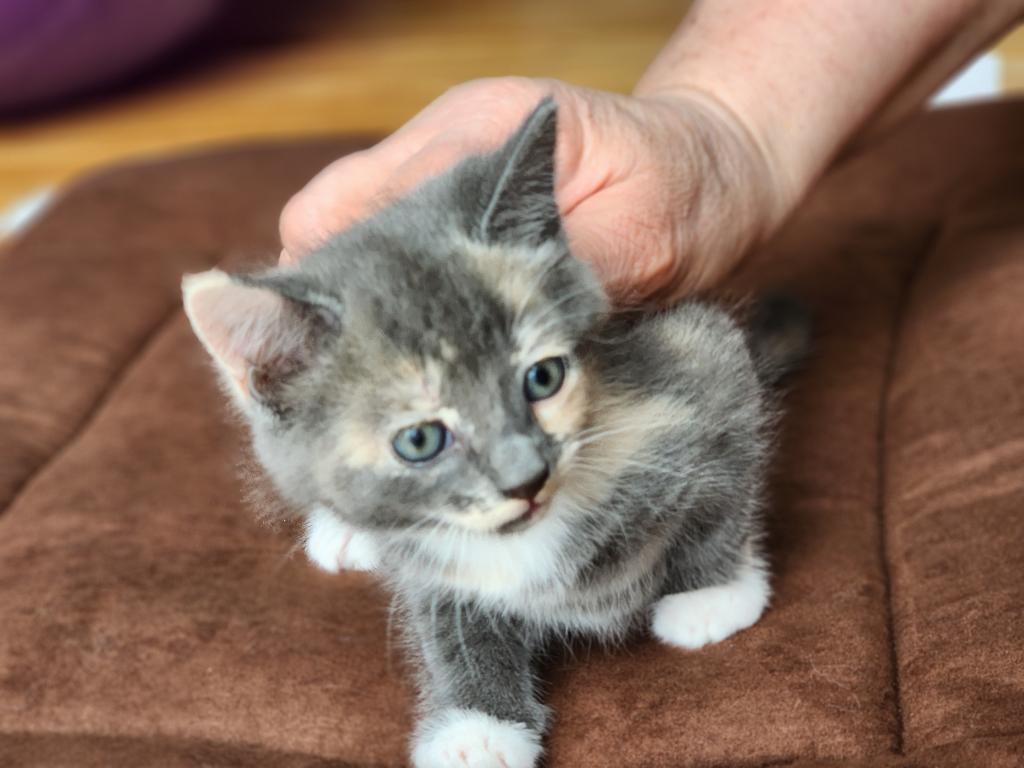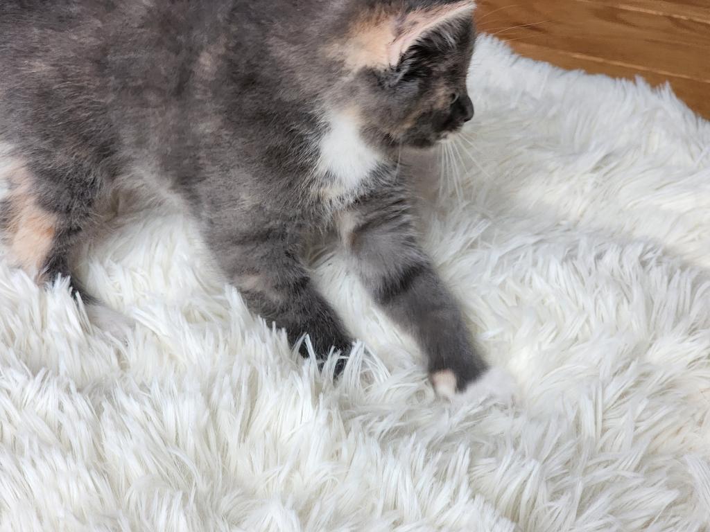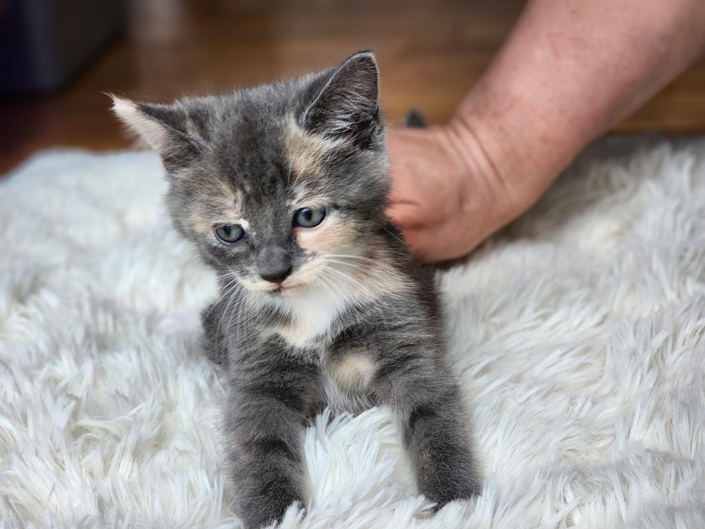 Kitten is litter trained, playful, eats soft and hard foods, and likes to cuddle.