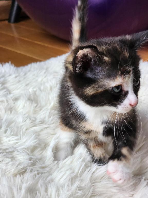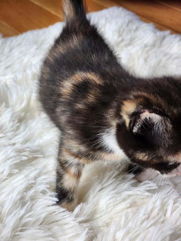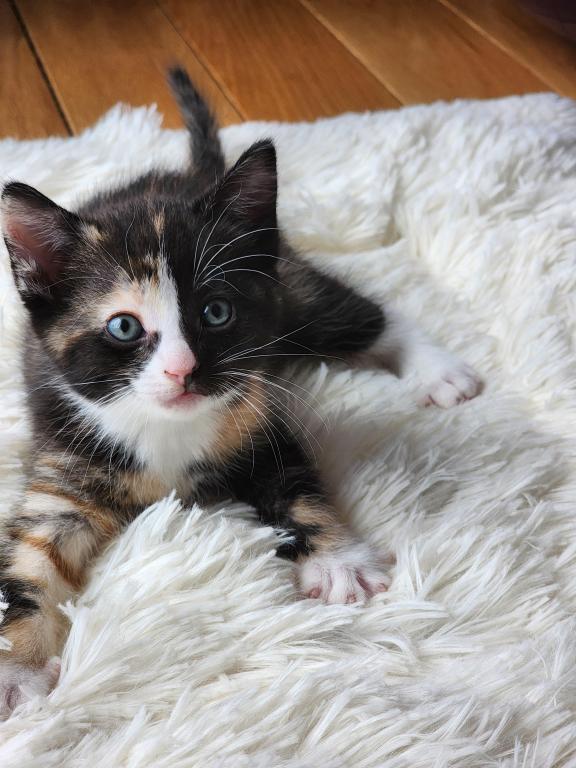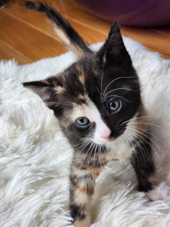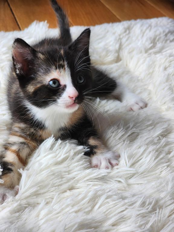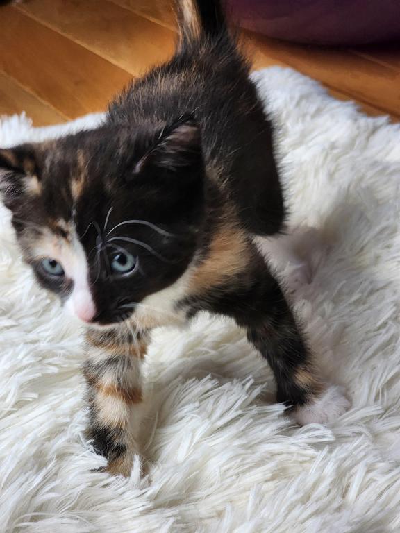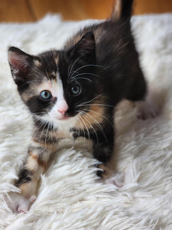 Kitten is litter trained, playful, eats soft and hard foods, and likes to cuddle.