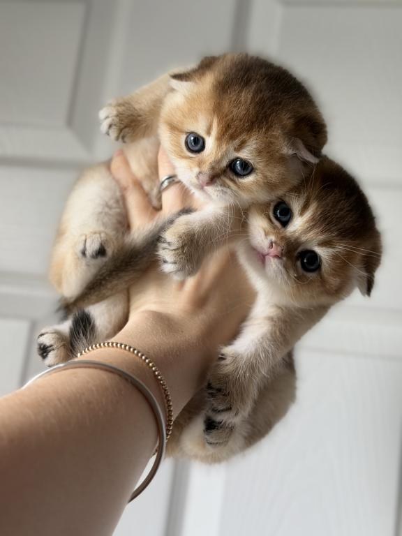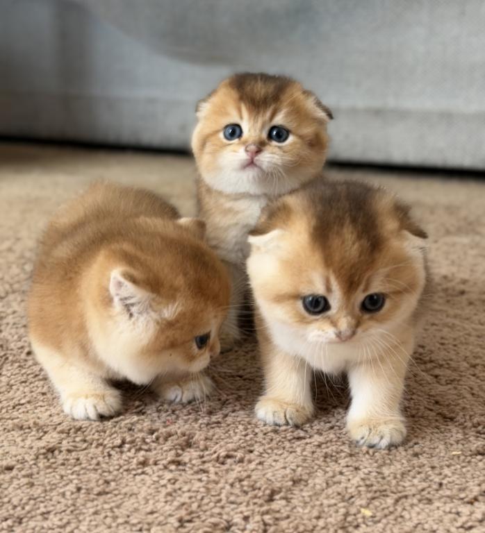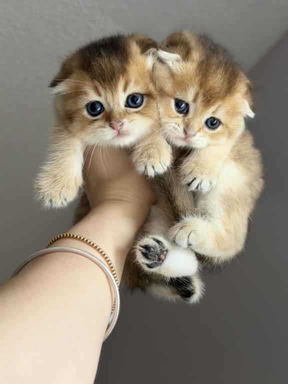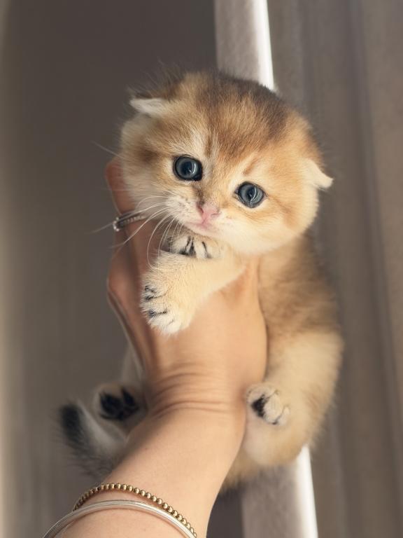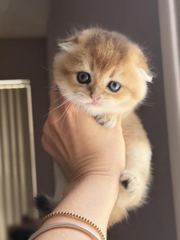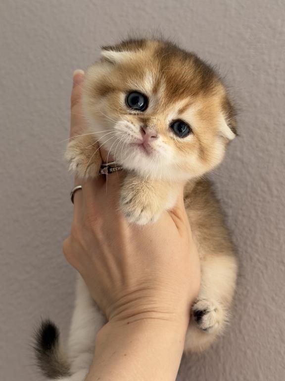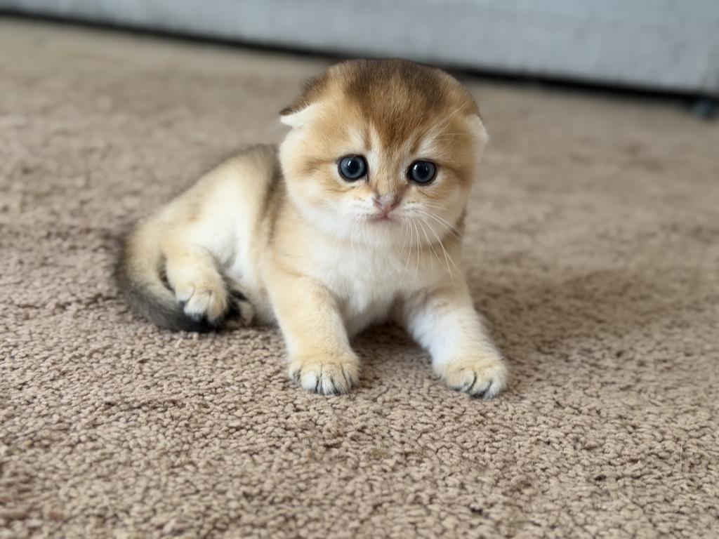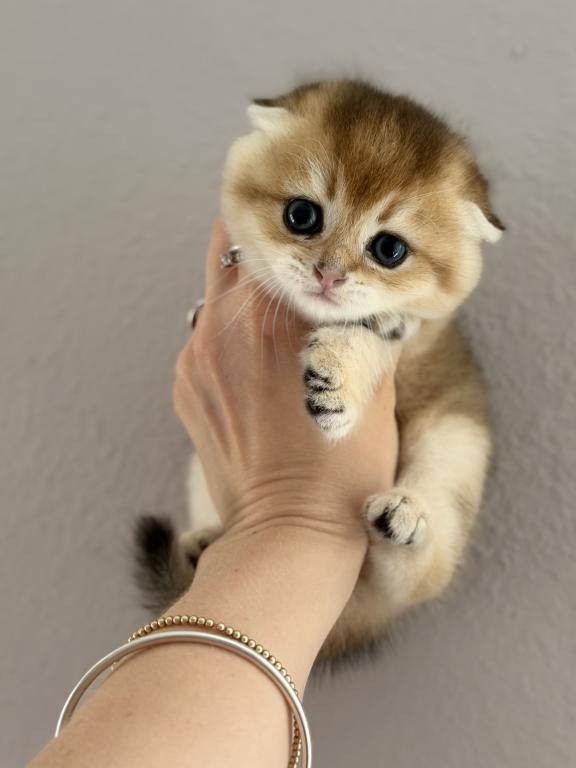 Beautiful Scottish Fold girl with a gorgeous golden shaded coat. She has a round face, small folded ears, big expressive eyes, and a very calm, sweet personality. Raised at home with love and care, she is very socialized and used to people. She will come with a full veterinary exam, first vaccinations, deworming, and Florida Health Certificate. She is growing in a clean family environment and will be ready for her new loving home soon.