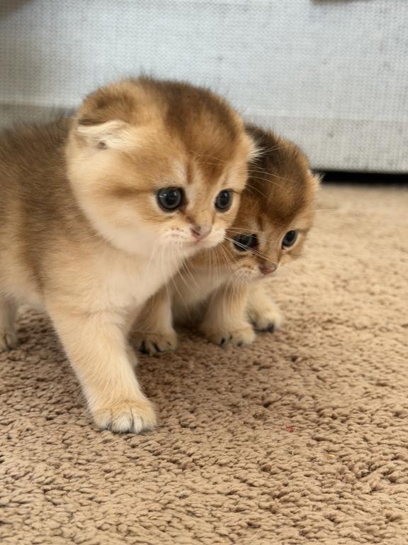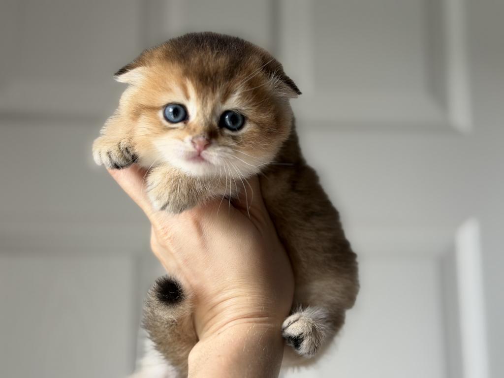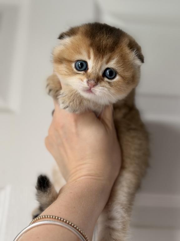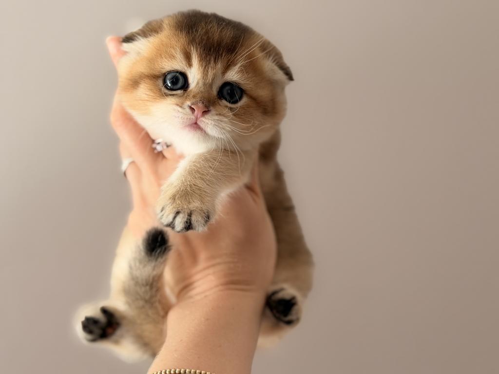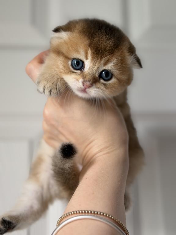 Adorable Scottish Fold boy with a beautiful golden shaded coat. He has a very round face, small folded ears, big blue eyes, and a sweet calm personality. Very fluffy and compact, with a teddy bear look.