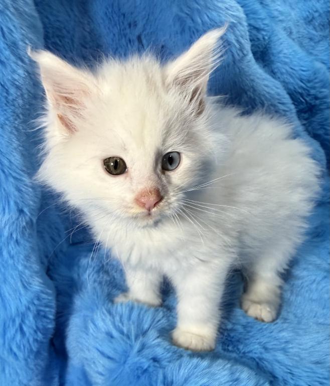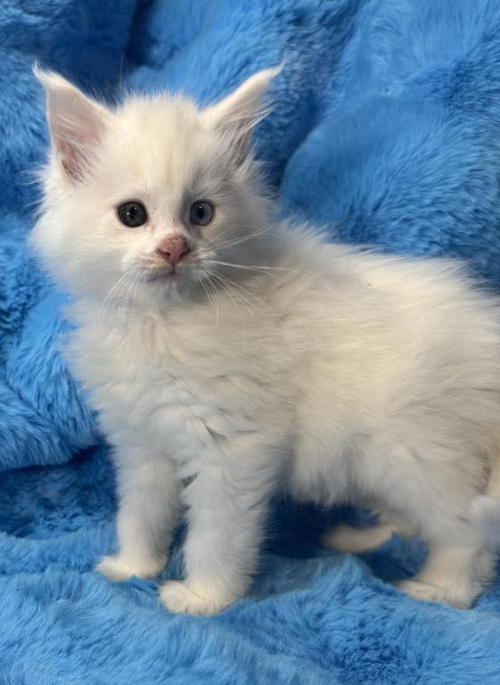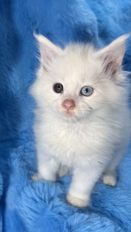 Meet Ziggy, this sweet beautiful girl is a rare white odd eye!! this European Maine coon kitten does amazing with young kids! she is awesome with dogs of all sizes and she does great with cats of all ages! She has been family raised right in my front room in the middle of all of the everyday stuff going on! She love attention and her wet cat food too! She is 100% litter box trained and is currently using the pet pivot auto box.