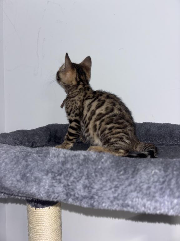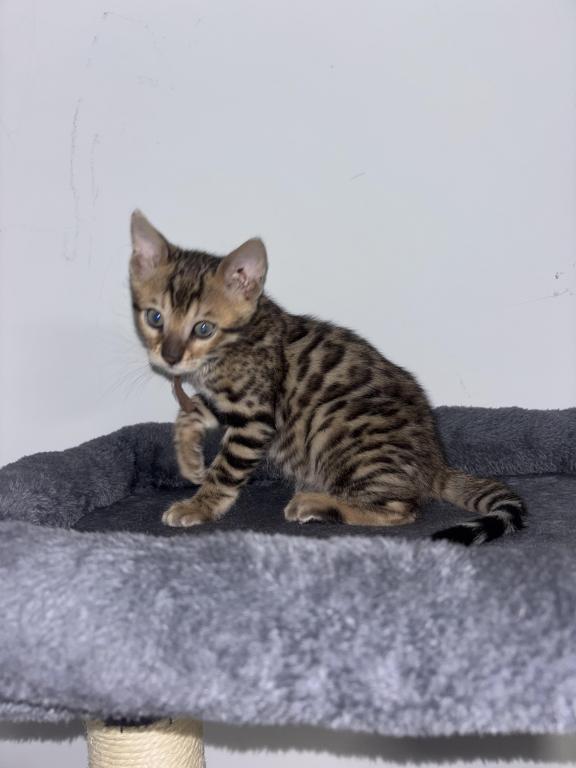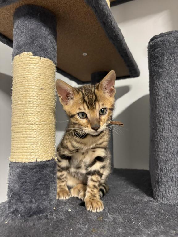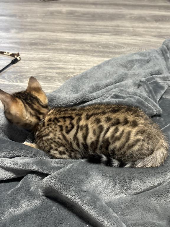 Camo is a beautiful bengal and if you see his patterns his person you’d be amazed! Camos name is inspired from his looks, but his energy and playfulness is what as well describes who he is. He is very joyful and always waiting for a moment to play and spend time with anyone who shows him kindness!!
