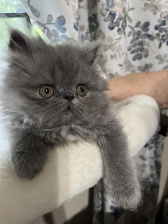 This is a registered flat face Persian in the color Blue. She is a friendly loving kitten looking for attention at all times .