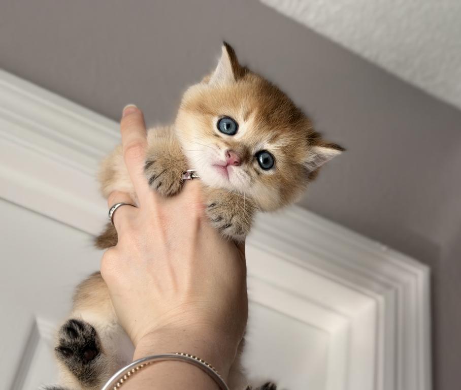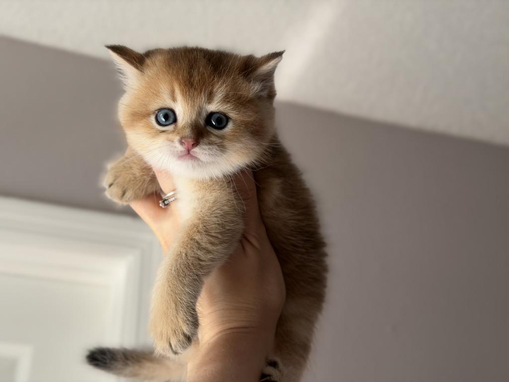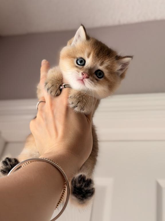 Male Scottish Straight kitten with a beautiful golden shaded coat and bright blue eyes. Very sweet, calm, and affectionate personality. Raised at home with lots of love and daily human interaction, well-socialized and used to household environment.