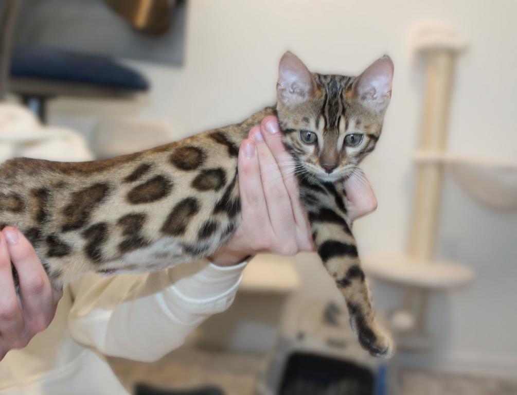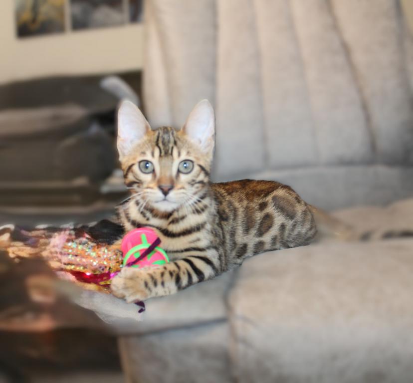 Leopard Rosetted markings on a clear golden glittered pelt. This girl is super playful and is so affectionate! She purrs and rubs and loves to be with people! She will make a great family pet or as a companion to another kitty!