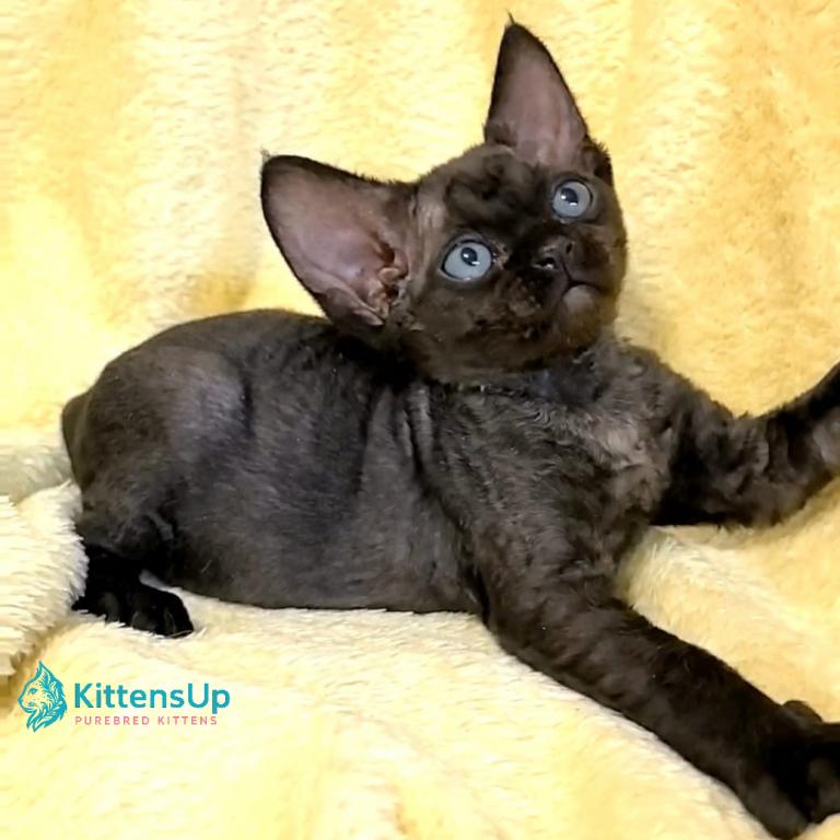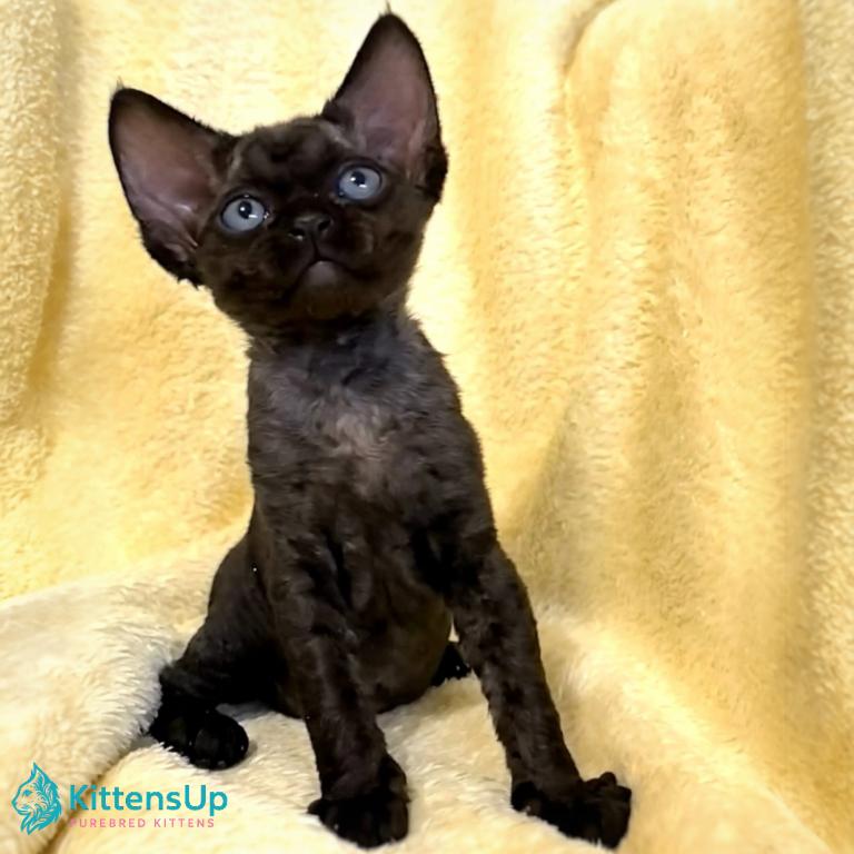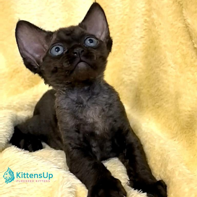 Meet Marcus, an adorable Devon Rex kitten with a unique short coat and big expressive eyes. This playful and affectionate kitten is ready to bring joy and charm into your home.