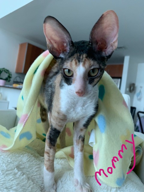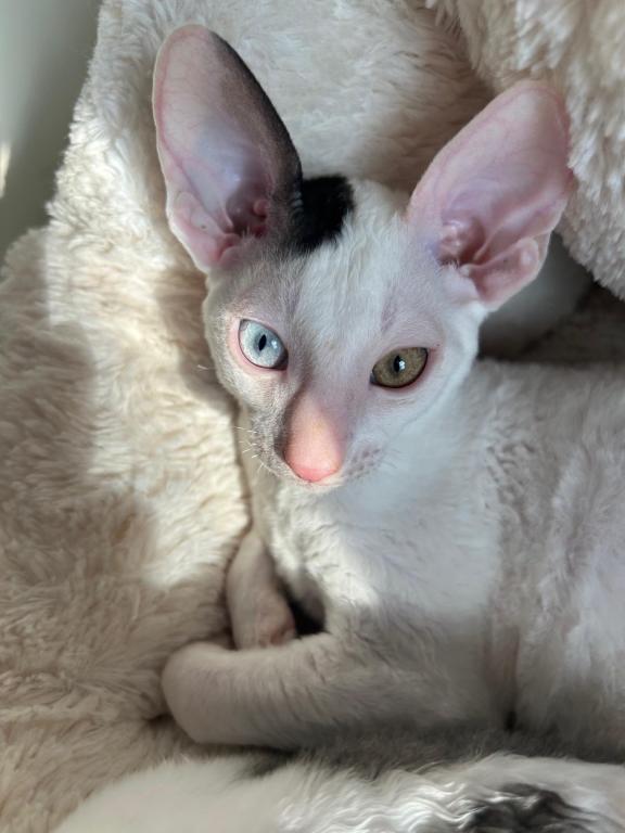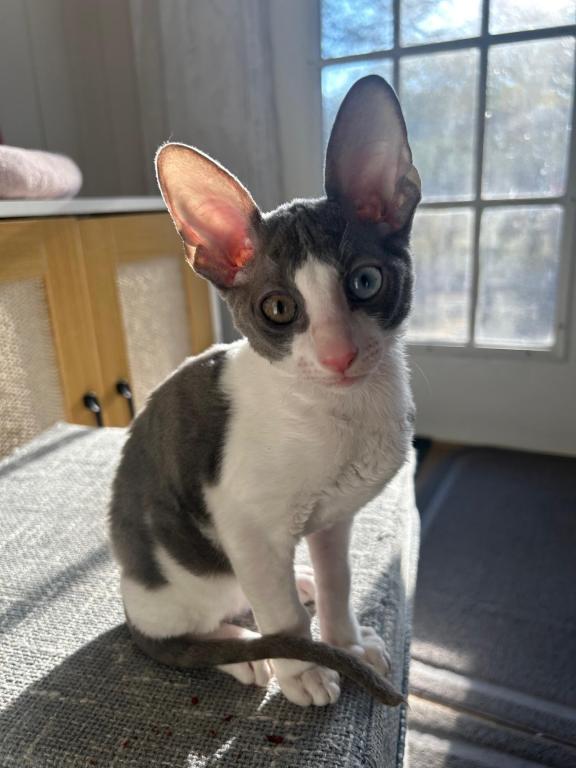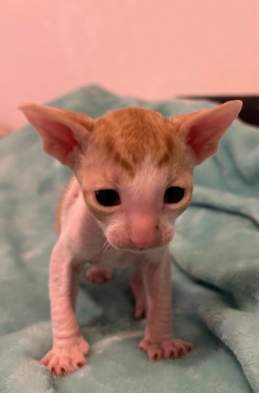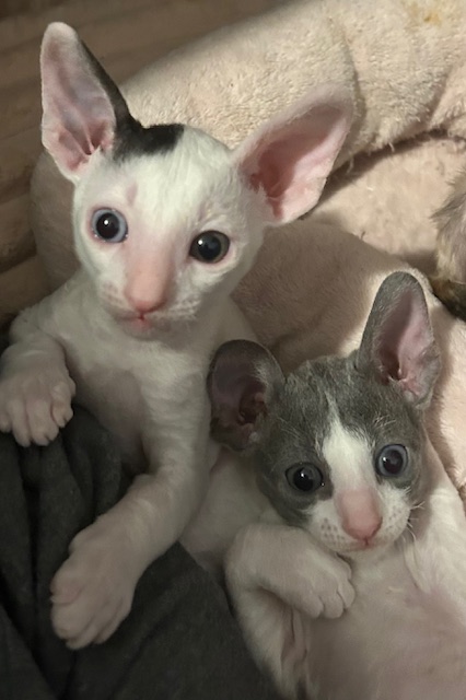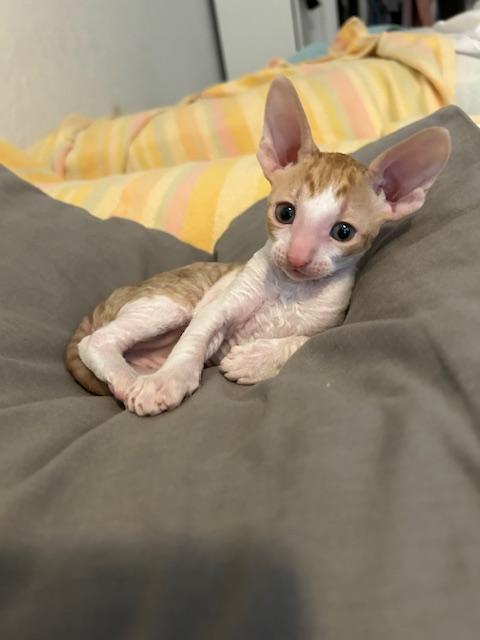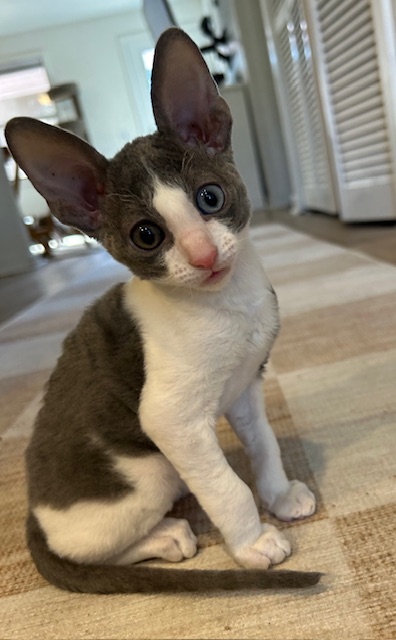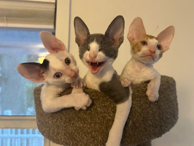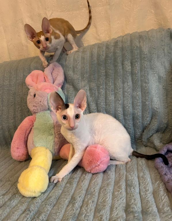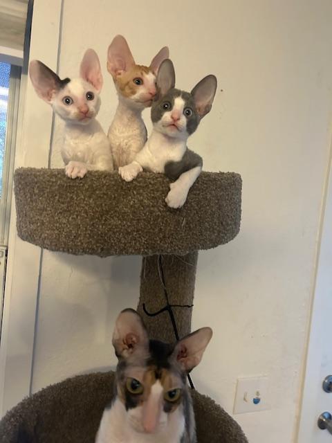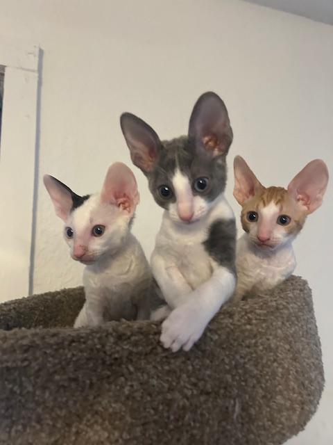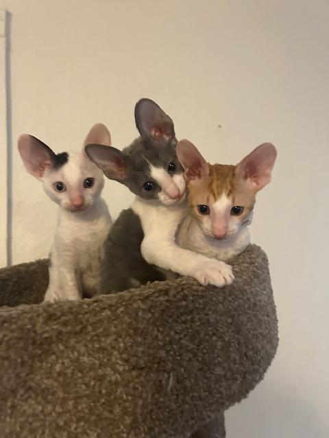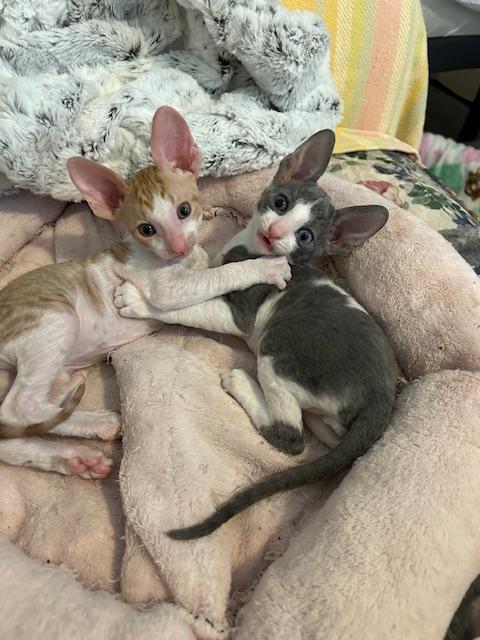 Show Quality Cornish Rex Kittens, male, typey, will have a plush curly coat at about 5 months, raised underfoot in active household, socialized extensively, desensitized to grooming, sounds, sights, etc., striving to send home to you the perfect kitten! Smart, fetches, rides around on your shoulder, learns tricks easily, athletic, funny, affectionate, interactive. Lifetime breeder support. Reserve with $300 downpayment. Contact info given for references from past kittens' furever humans and breeder's veterinarian. Please inquire, we would love to meet you! Price negotiable for the right family or cattery. Thank you!