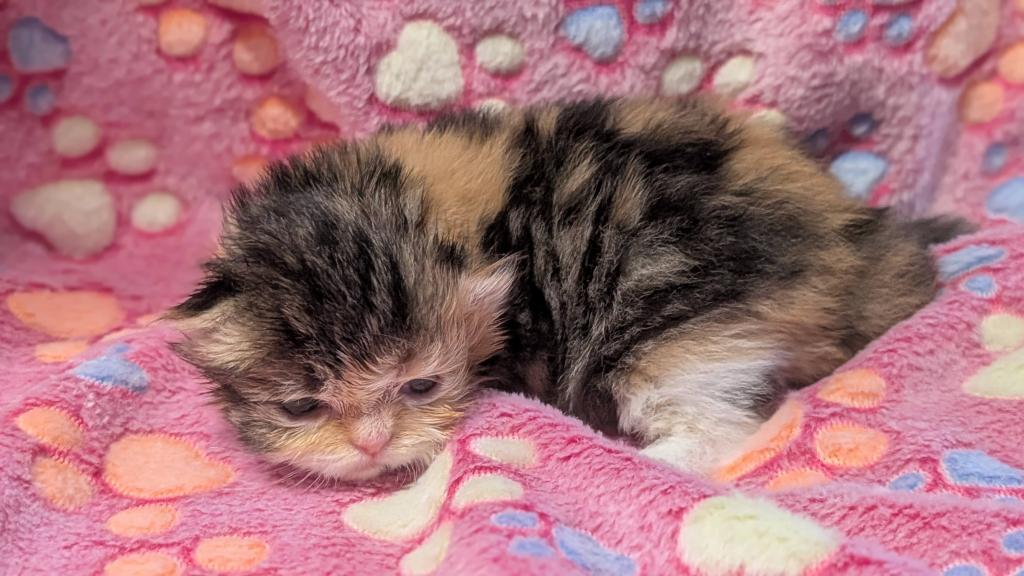 Mabel is a rich calico color. She has 2 sisters ands one brother. Her little eyes are just starting to open. Over the next couple of weeks Mabel’s personality will start to come out.