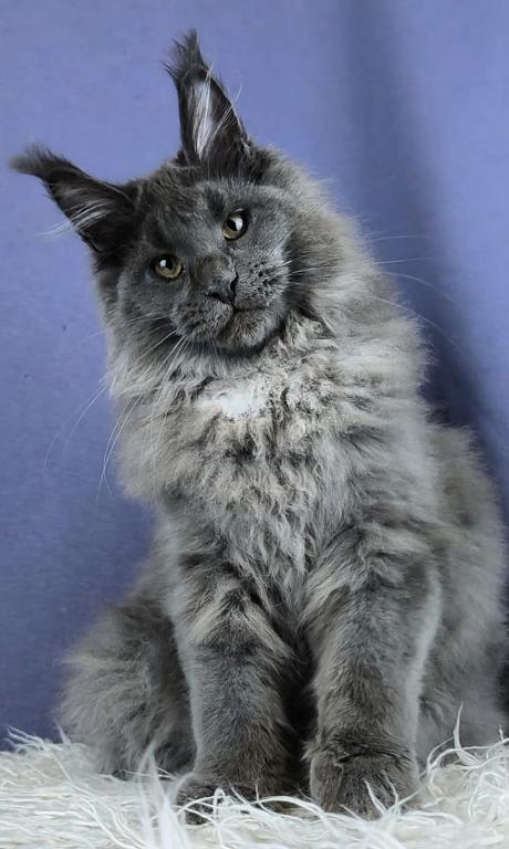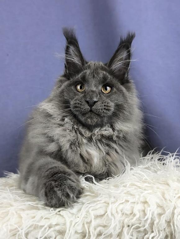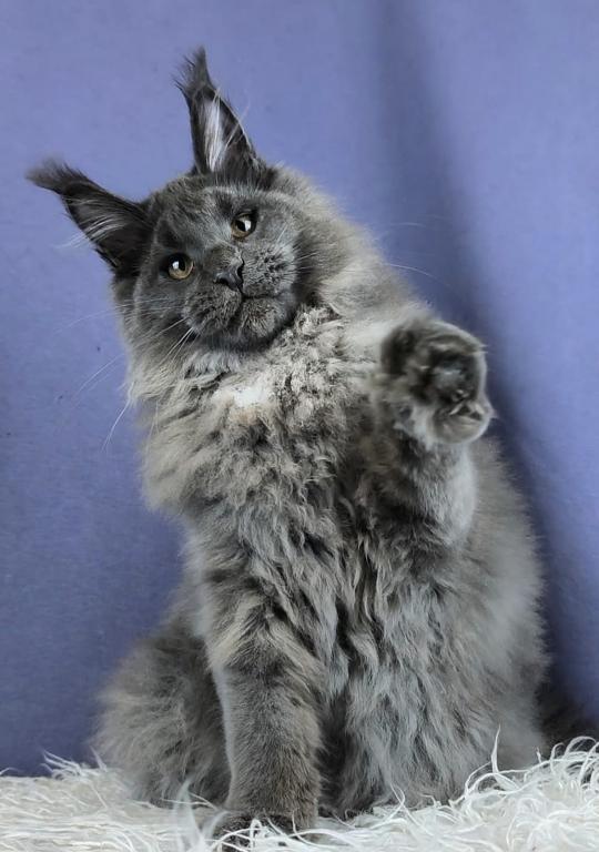 Meet Yakut, a stunning Maine Coon kitten with a striking coat. This kitten has the signature large build, fluffy coat, and playful personality that makes the Maine Coon one of the most popular and beloved cat breeds in the world. The kitten has a tail curvature.
