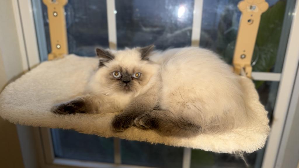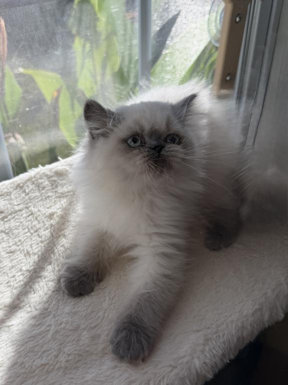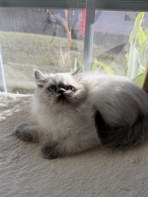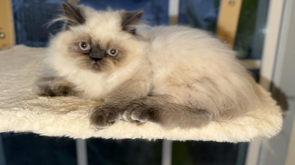 Zander is a gorgeous blue point Himalayan. His personality is very loving and affectionate, he enjoys playing with his toys and lounging in the cat tree!